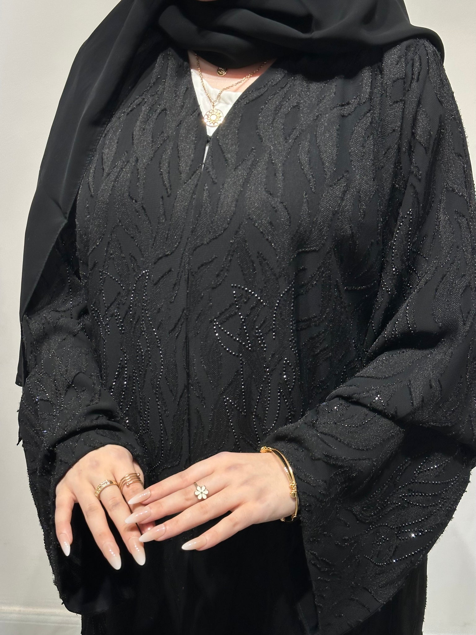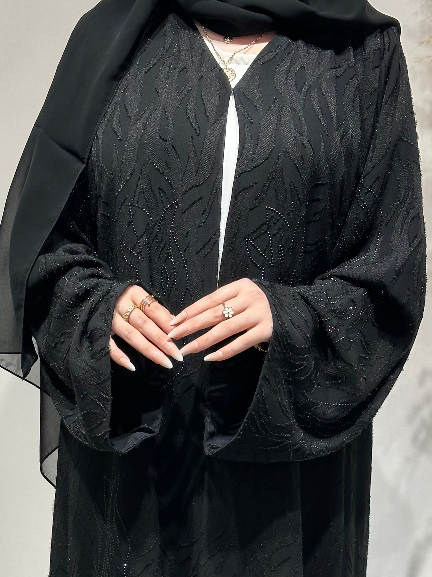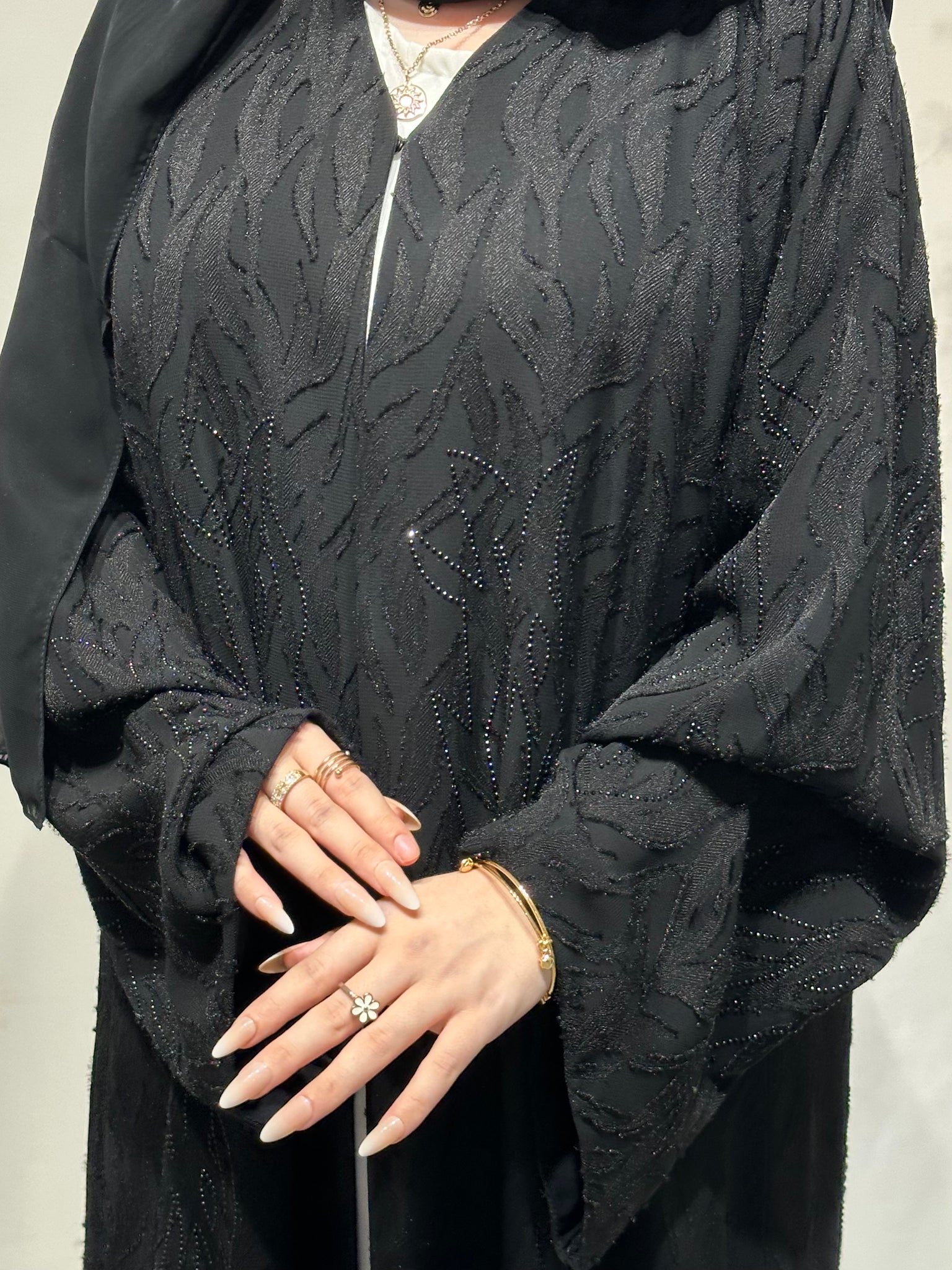 اكتشفي الأناقة والراحة مع عبايتنا السوداء المزينة بالخرز - الشيفون ، المصنوعة من الشيفون الخفيف الفاخر لإطلالة انسيابية أنيقة. ملمسها الناعم مع تطريز الخرز الرقيق يضفي عليها لمسة من التألق، ما يجعلها مثالية لعاشقات الموضة الراقية والمحتشمة.