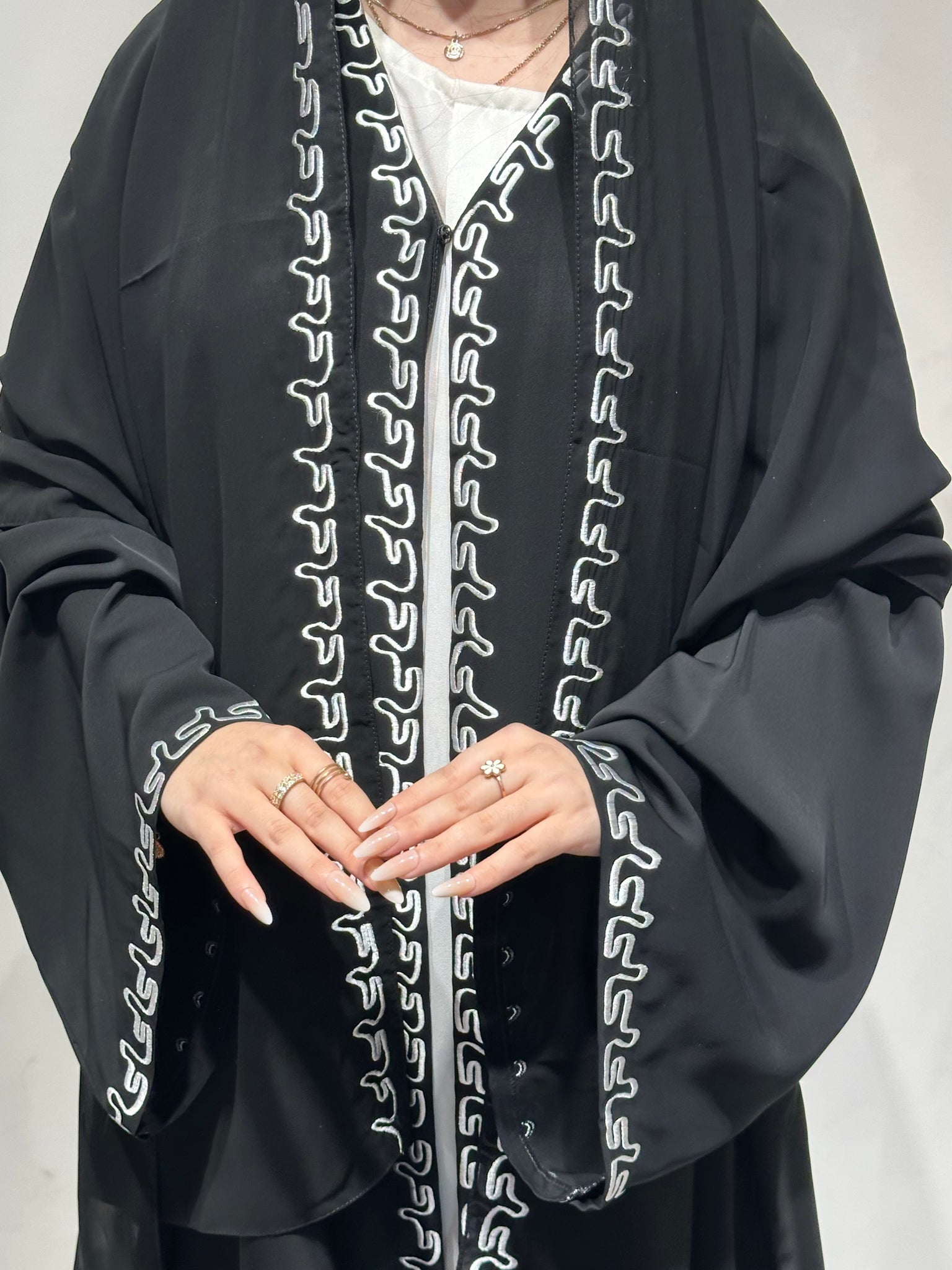 اكتشفي أناقة راقية مع عبايتنا السوداء المطرزة ، المصنوعة من قماش ندى الفاخر، المعروف بملمسه الناعم، وراحته، وانسيابيته الفاخرة. تتميز هذه العباءة السوداء الخالدة بتفاصيل تطريز دقيقة ، مما يضفي عليها لمسة من الرقي دون المساس بالحياء.