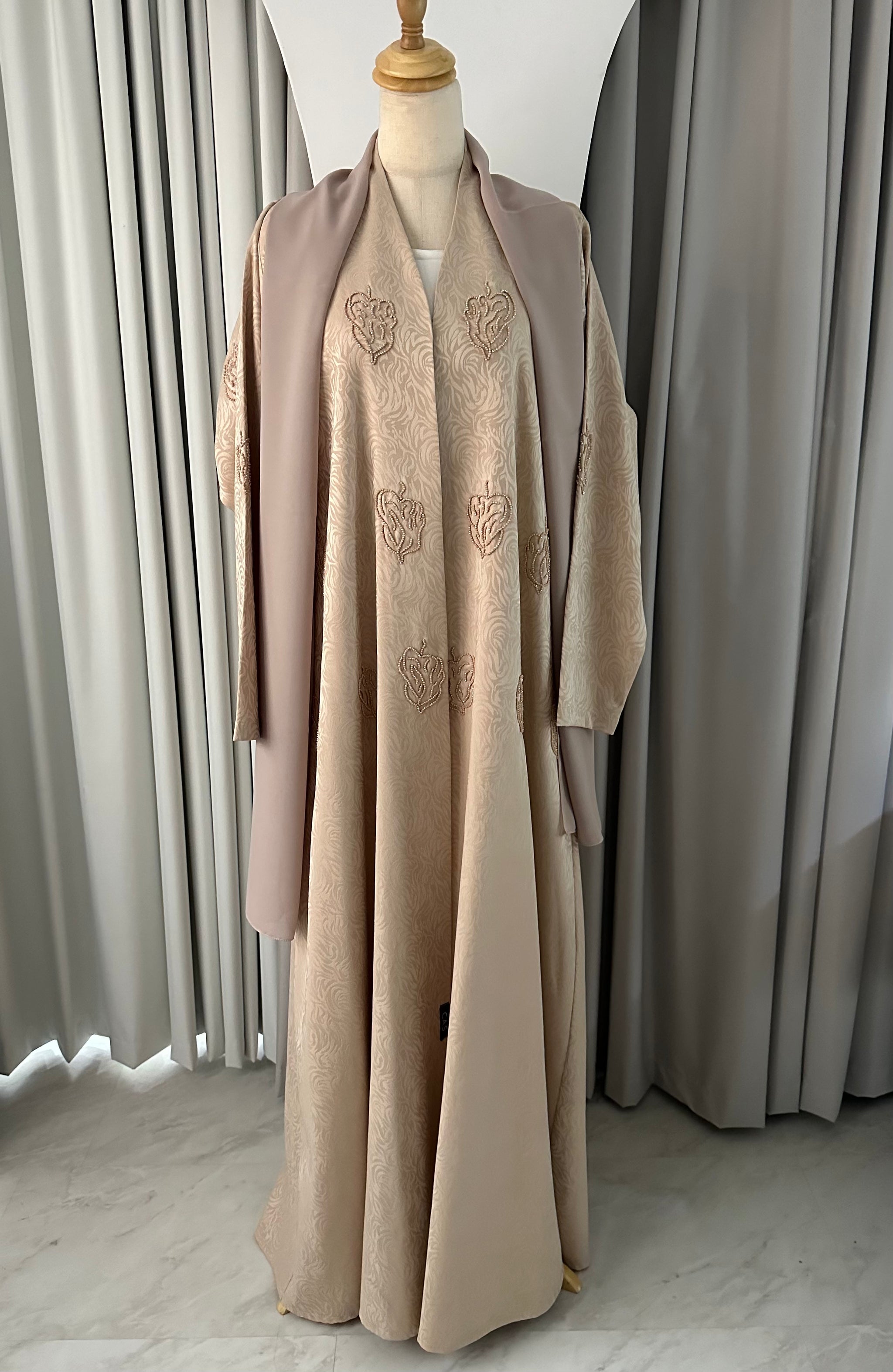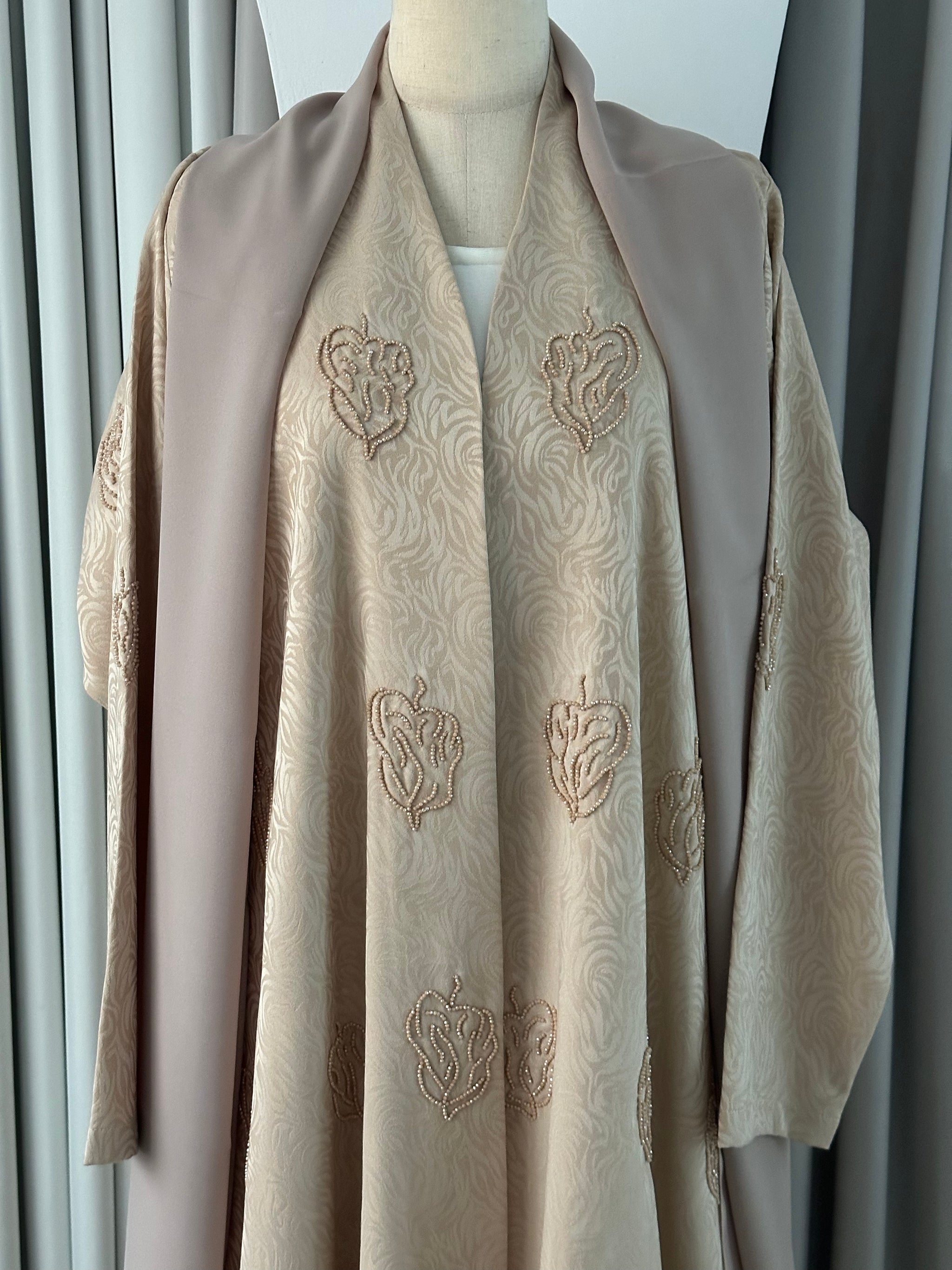 عززي خزانة ملابسك بهذه العباءة البيج المزينة بالخرز، المصنوعة من قماش الجاكار الفاخر الناعم لإطلالة أنيقة وفاخرة. مصممة بتفاصيل خرز يدوية دقيقة، تجمع هذه العباءة بين الأناقة والراحة والعملية اليومية، مما يجعلها مثالية للمناسبات الخاصة أو العمل أو الإطلالة اليومية الأنيقة.