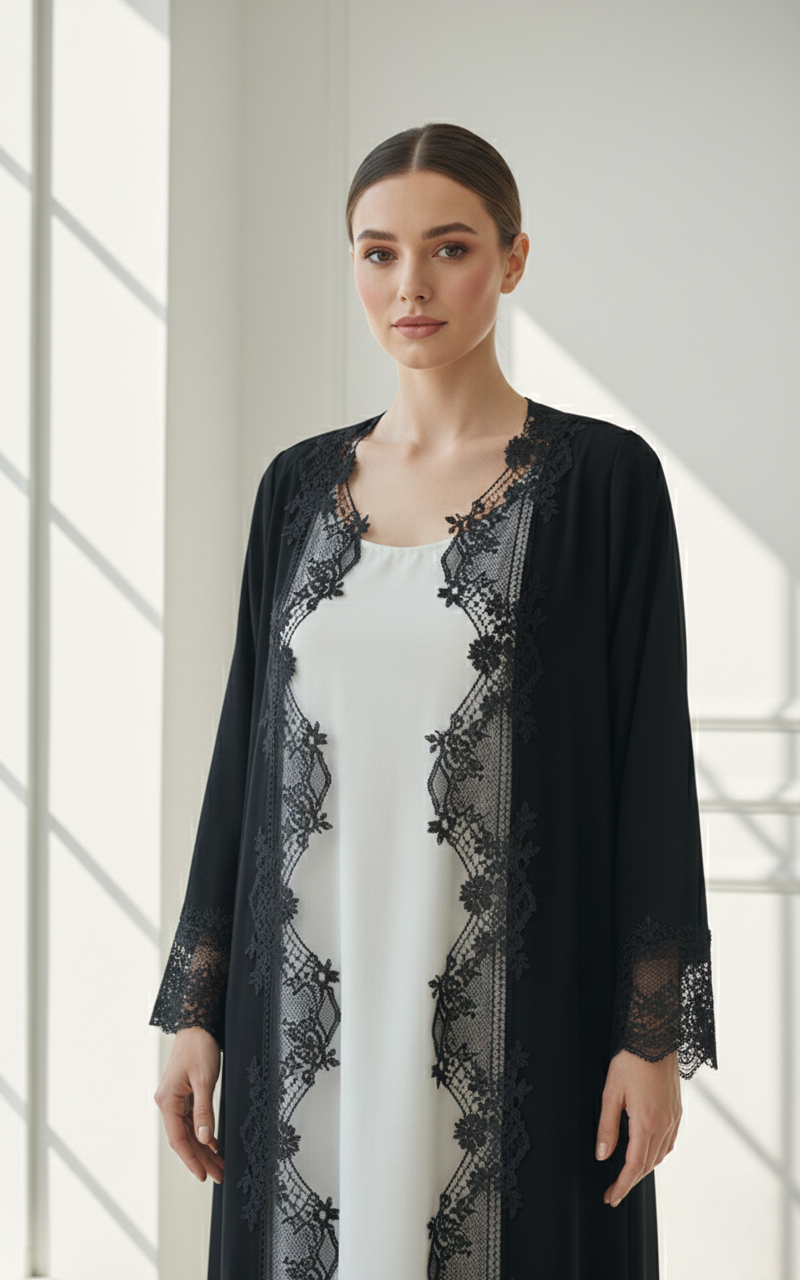 Delicate floral lace accents add softness and visual depth, enhancing the abaya with understated elegance. As part of our signature abaya collection Dubai, this design reflects the artistry and sophistication expected from a designer abaya Dubai label. Perfect for formal occasions, evening gatherings, or elegant everyday wear, it balances comfort with luxury. For those seeking a standout luxury abaya UAE essential and searching for where to buy best abaya in Dubai, CAS Abaya delivers exceptional craftsmanship and modern Emirati elegance in every piece.