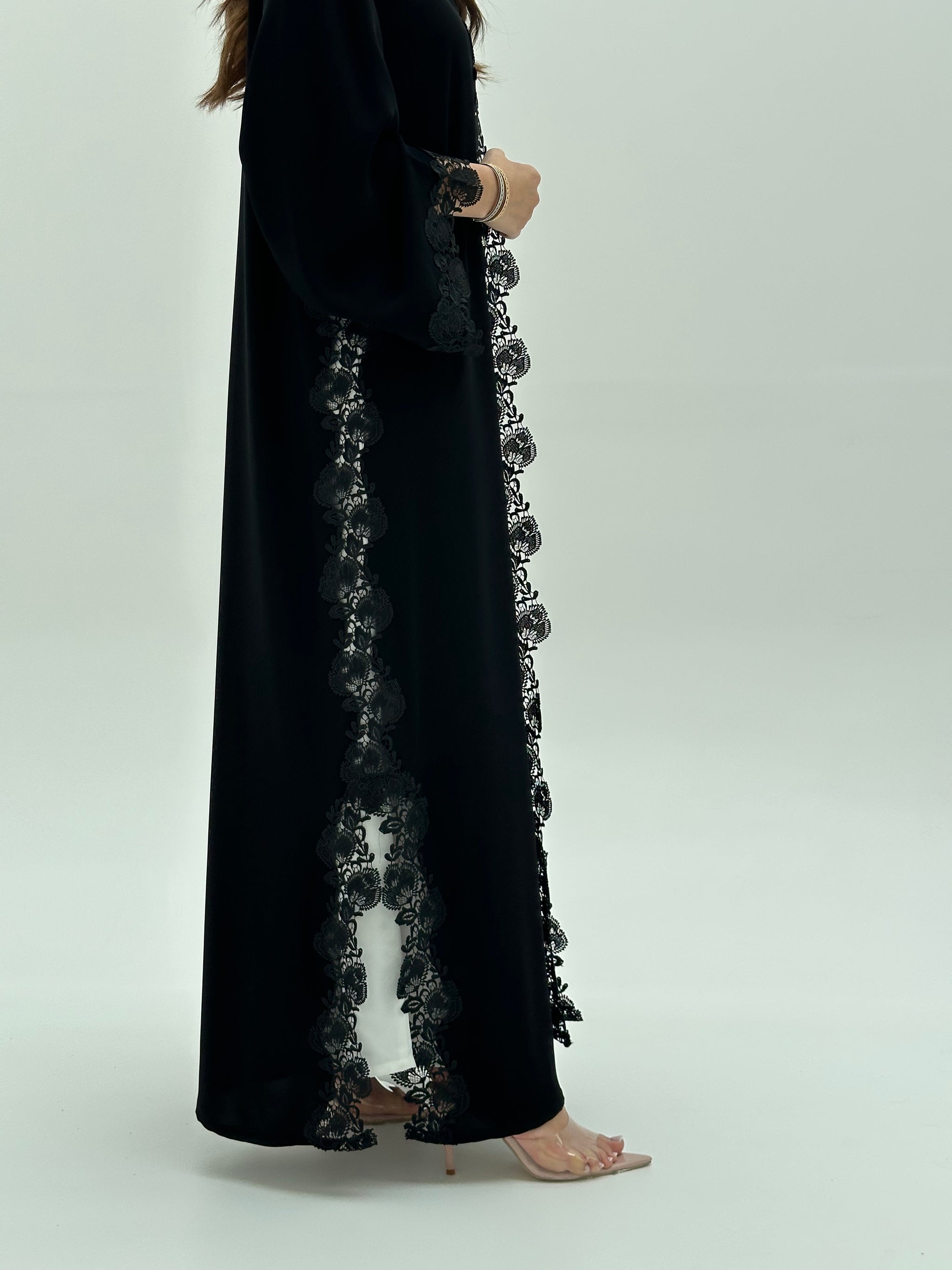 يُضفي اللون الأسود الكلاسيكي لمسةً راقيةً على نقوش الدانتيل الزهرية الرقيقة، مما يجعل هذه العباية الإماراتية الفاخرة مثاليةً للمناسبات الخاصة والسهرات الأنيقة. يوفر قماش الكريب راحةً تدوم طوال اليوم دون التنازل عن الأناقة، مُجسداً التزام CAS Abaya بابتكار تصاميم إماراتية أنيقة تُبرز التراث والفخامة العصرية في تناغمٍ تام.
