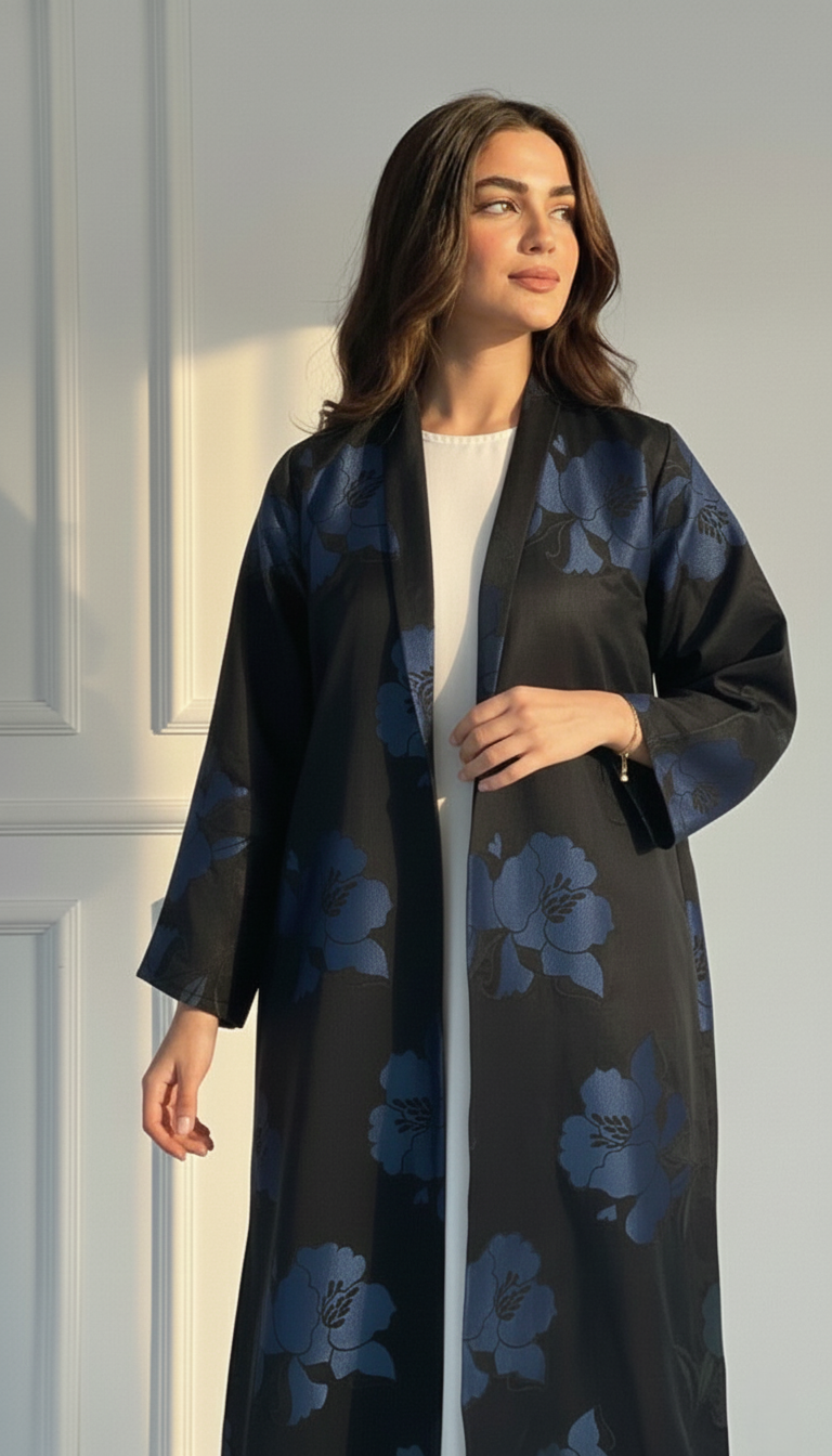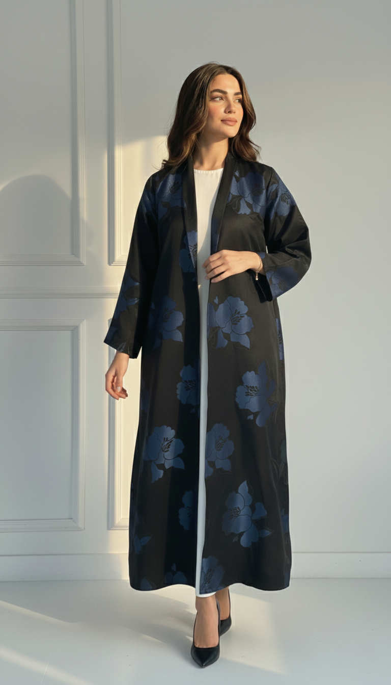 يُضفي اللون الأزرق الداكن لمسة من الرقي، مما يجعله مثالياً للمناسبات المسائية، والتجمعات الرسمية، أو المناسبات الخاصة. يجمع هذا العباية ببراعة بين الأناقة الكلاسيكية المحتشمة والعصرية.