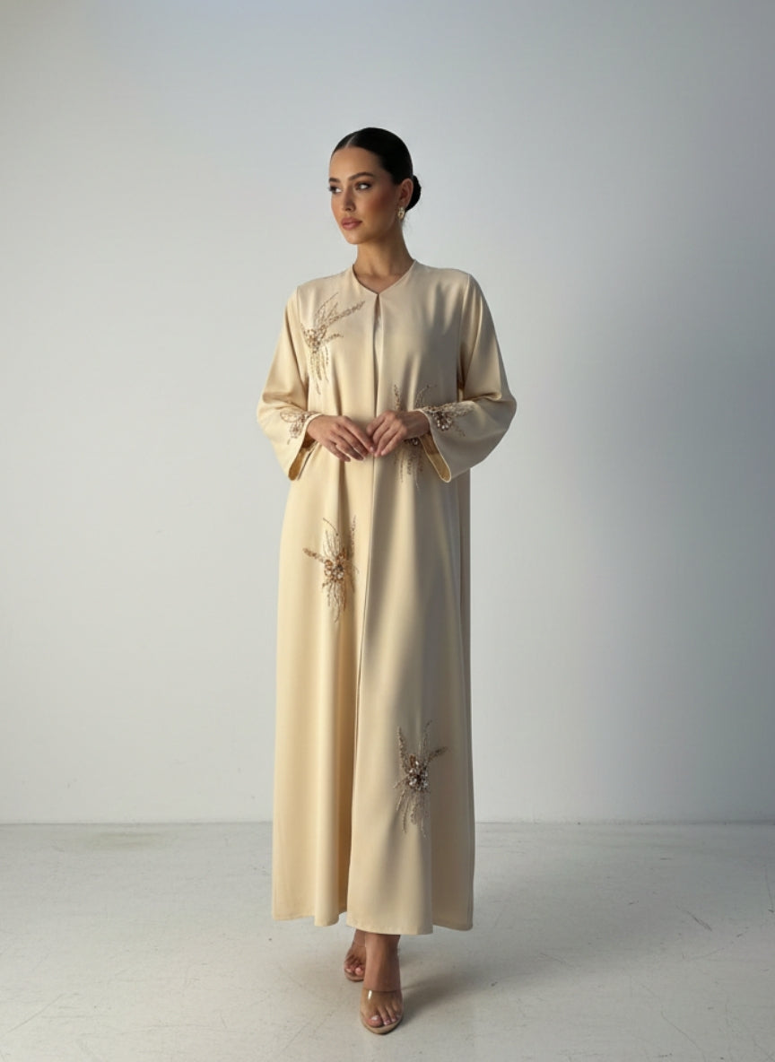 The Beige Beaded Abaya by CAS Abaya blends subtle luxury with classic Emirati elegance. Crafted in soft beige crepe fabric, this premium abaya offers a smooth, flowing drape that feels lightweight and comfortable all day. Delicate beadwork enhances the design, adding a refined sparkle while keeping the overall look modest and sophisticated. Ideal for formal events or chic everyday wear, this luxury abaya Dubai piece reflects modern modest fashion with timeless appeal.