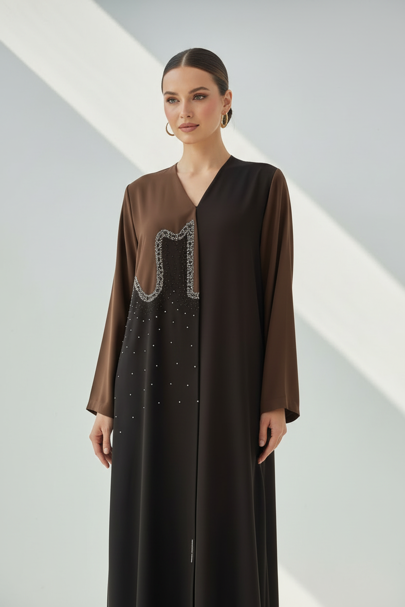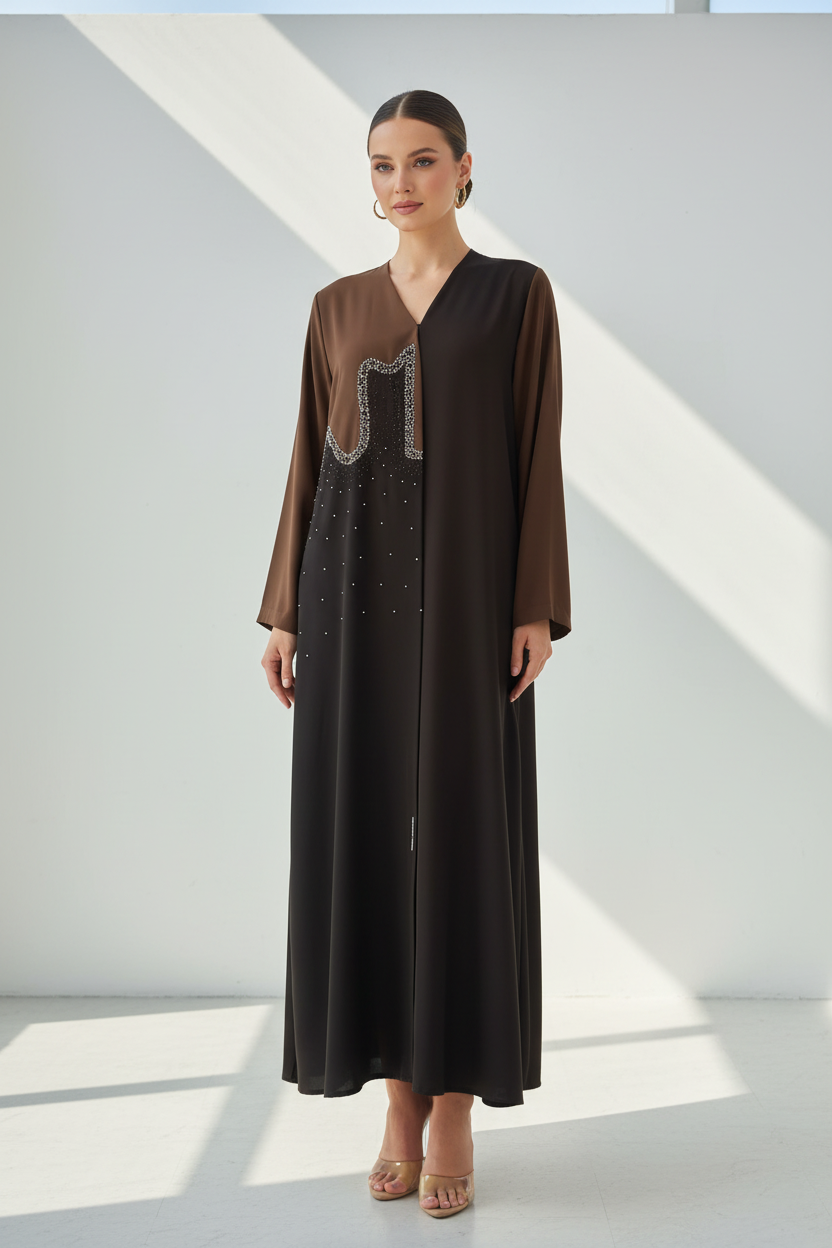 Embrace warm sophistication with the C 1920 Coffee Brown Beaded Abaya from CAS Abaya, where luxury Dubai abaya craftsmanship meets timeless elegance. This designer abaya UAE showcases intricate beaded embellishments in a rich coffee brown hue that creates a captivating and refined look, making it a true signature piece for the modern Emirati woman who appreciates distinctive modest fashion.