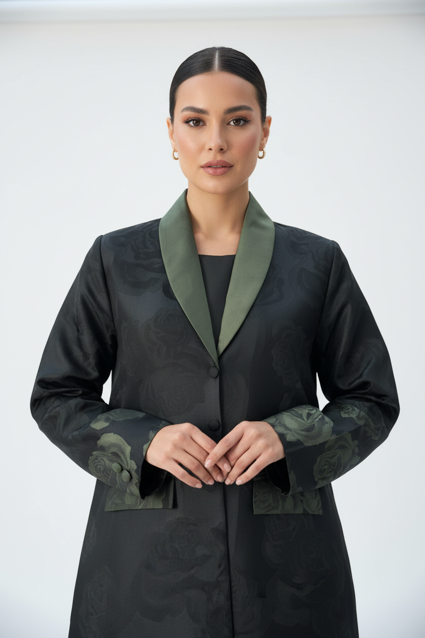 The Sage Green Rose Abaya by CAS Abaya is a graceful expression of modern luxury Dubai abaya design. Crafted from premium jacquard fabric, this Dubai abaya features a subtle textured pattern that adds depth and elegance to the overall silhouette. The soft sage green tone combined with delicate rose-inspired detailing creates a refined, feminine look ideal for special occasions and elevated modest fashion styling. Inspired by elegant Emirati abaya traditions, this piece perfectly balances classic charm with modern abaya Dubai aesthetics.