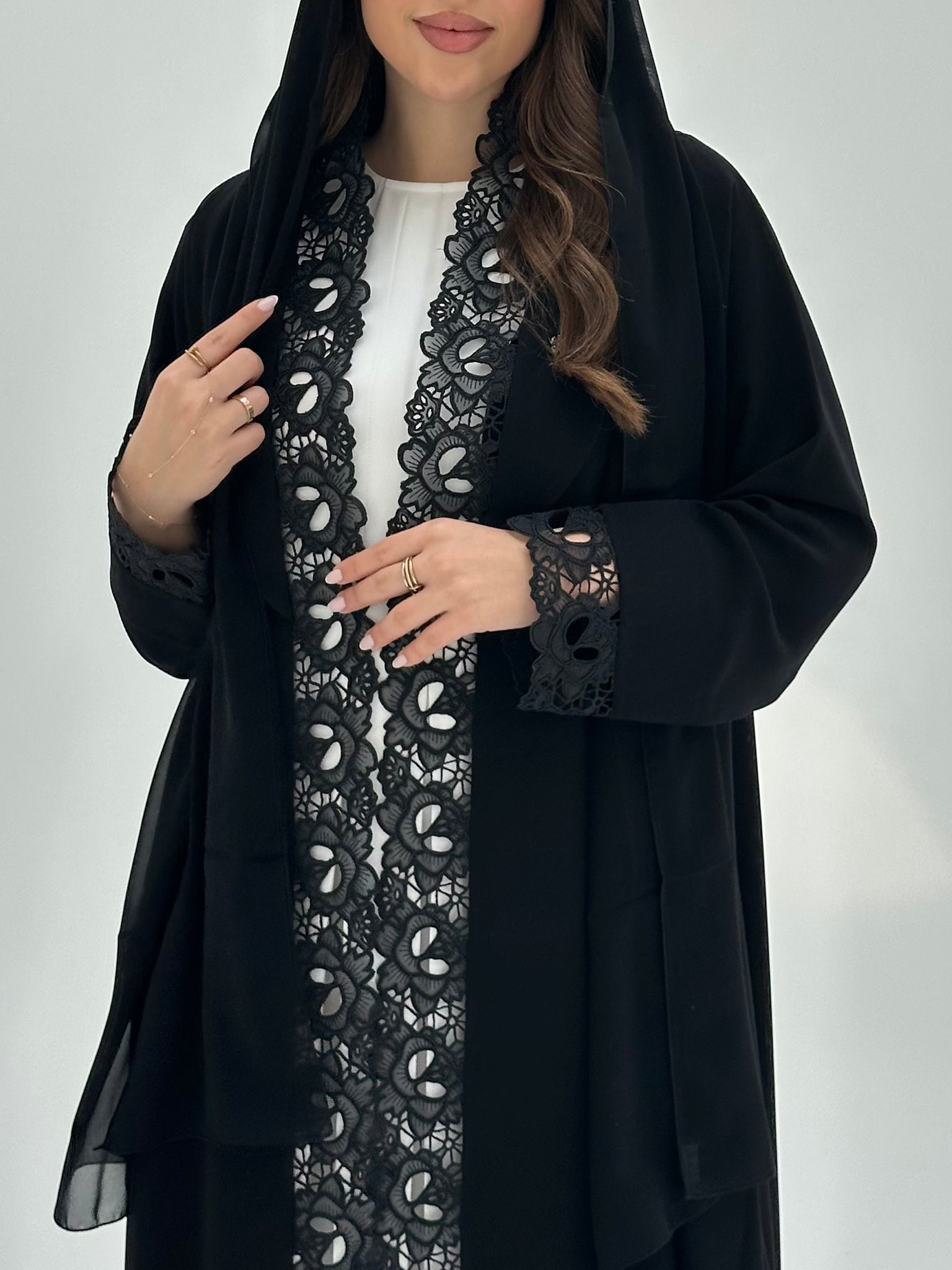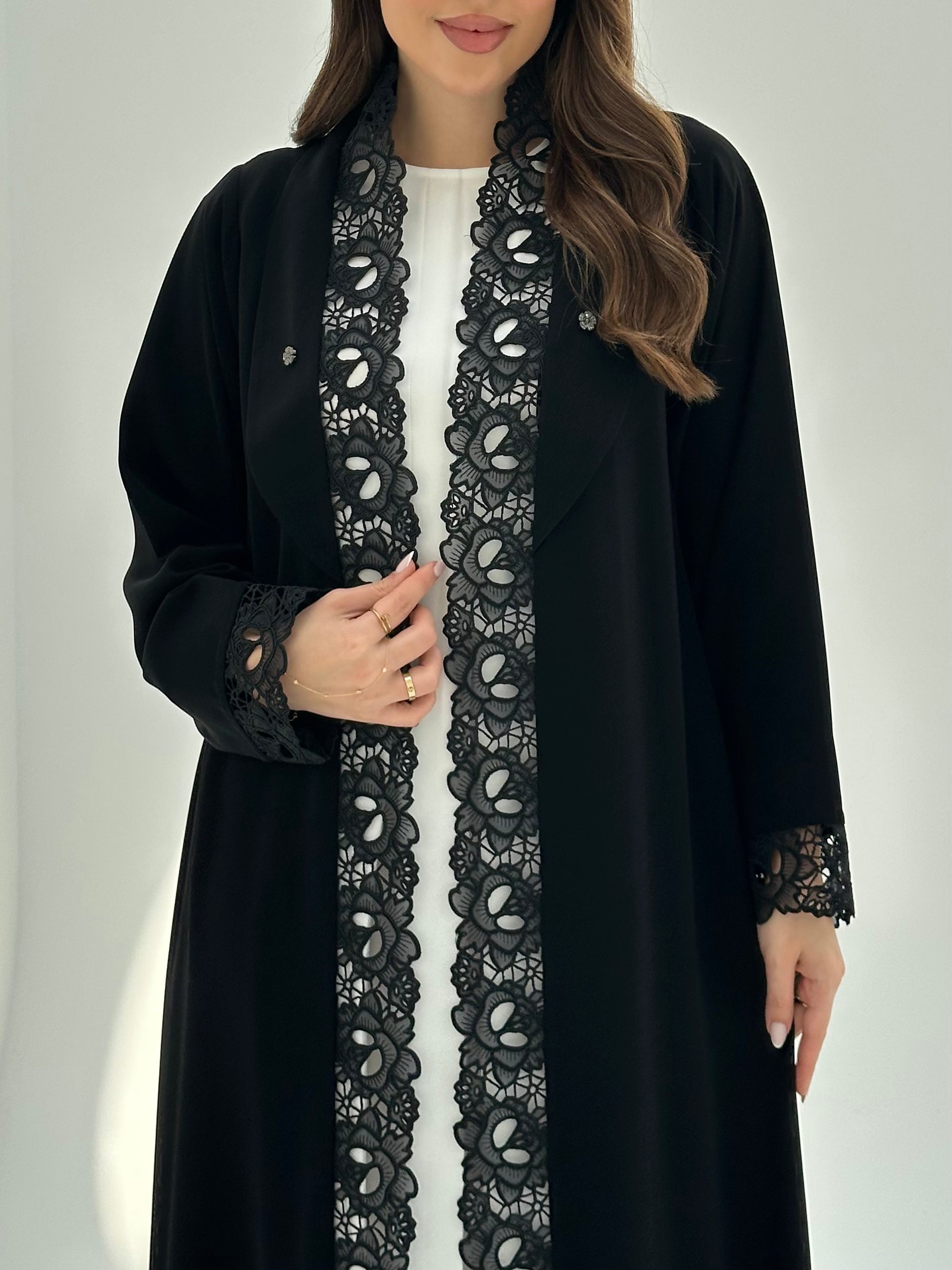 Add timeless beauty to your wardrobe with the Black Floral Lace Abaya by CAS Abaya, crafted from premium Nada fabric for a lightweight, smooth, and elegant drape. The intricate floral lace detailing brings a feminine and refined touch, making this piece a standout Luxury Dubai abaya for formal occasions, evening events, or graceful everyday wear. Its flowing silhouette reflects the charm of an Elegant Emirati abaya, designed to offer both comfort and sophistication.