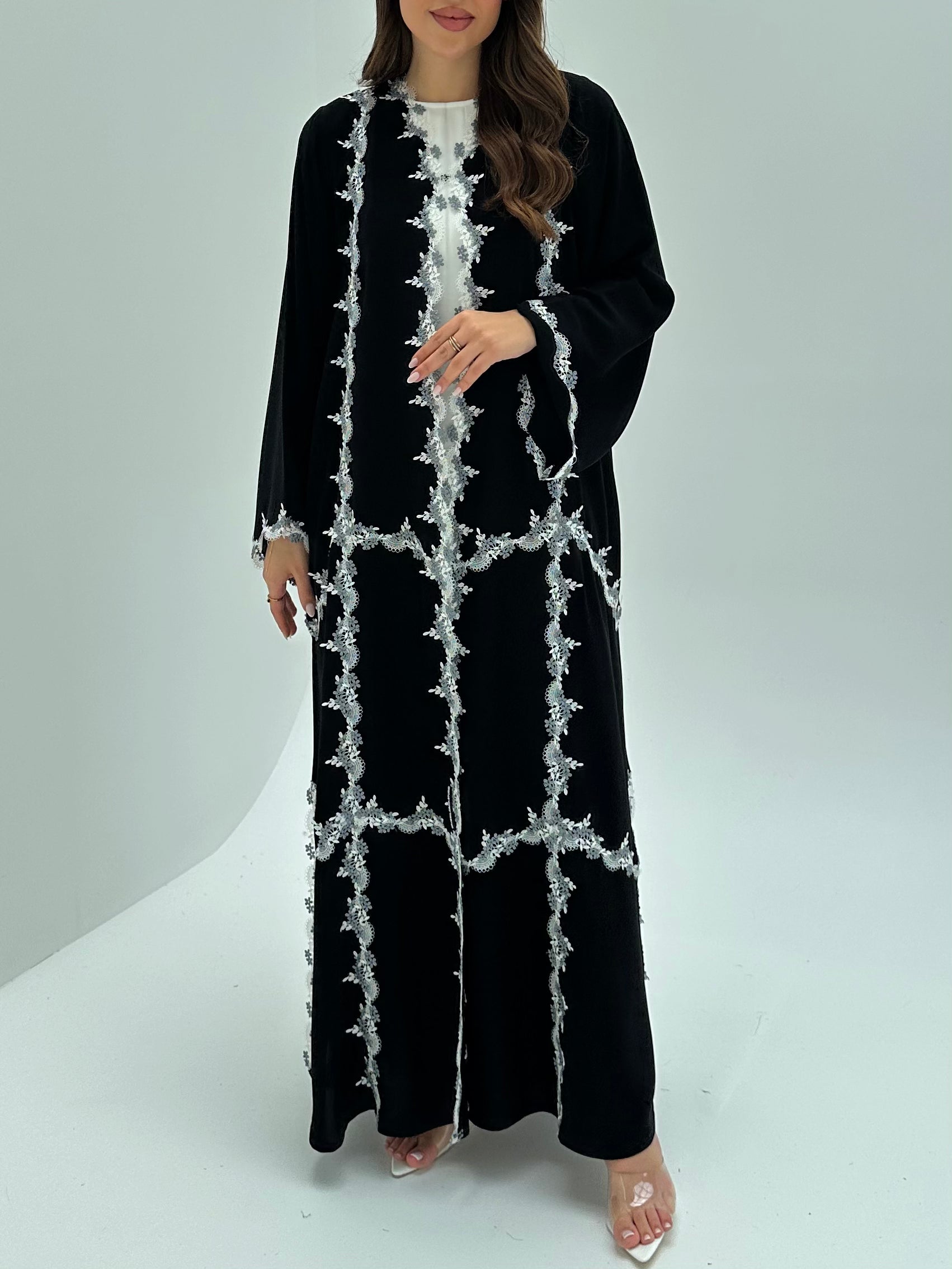 Add timeless sophistication to your wardrobe with the Black Floral Lace Abaya by CAS Abaya, crafted from premium Nada fabric for a lightweight, smooth, and elegant drape. The delicate floral lace detailing adds a feminine and refined touch, making it a standout Luxury Dubai abaya for formal events, evening gatherings, or stylish everyday wear. Its flowing silhouette offers comfort while reflecting the elegance of an Elegant Emirati abaya and the expert craftsmanship of a Designer abaya UAE.