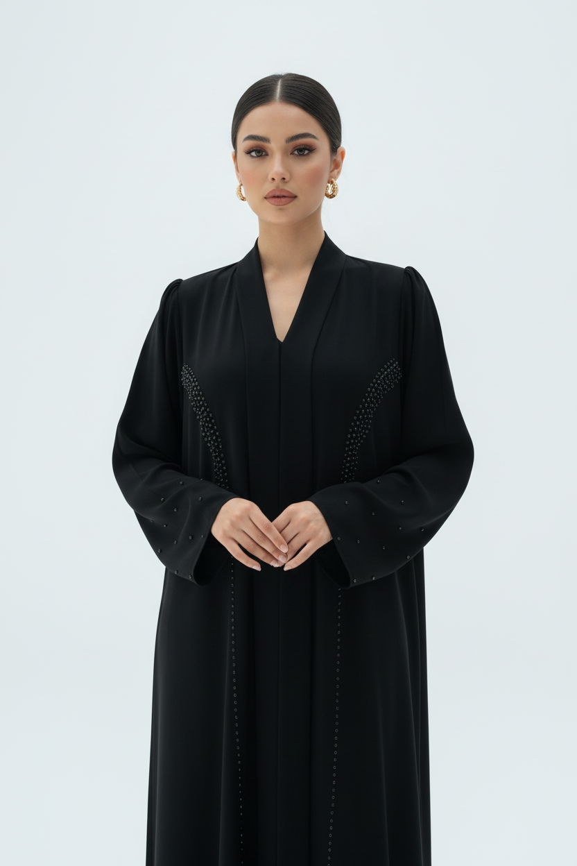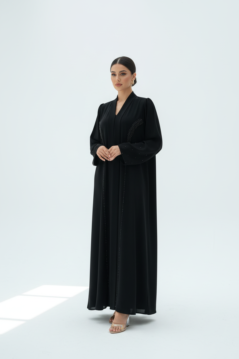 Crafted from premium Nada fabric, this exclusive abaya Dubai offers exceptional quality and a luxurious drape that flatters every silhouette. The meticulous beadwork is carefully placed to create stunning patterns that honor traditional Emirati artistry while embracing contemporary sophistication. This best Dubai abaya represents the perfect balance between timeless elegance and modern luxury, ideal for special occasions and elegant evening events.