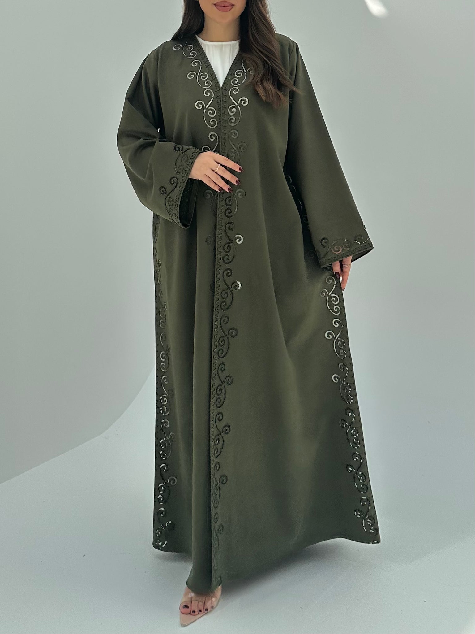 Step out in modern elegance with the Olive Lasercut Abaya, crafted from soft suede and featuring intricate lasercut detailing. This designer Dubai abaya offers a contemporary twist on modest fashion, perfect for Ramadan, Eid, casual outings, or special occasions. The lightweight suede fabric ensures comfort, while the precise lasercut patterns add a refined, stylish edge. Ideal for women who love trendy, high-end modest fashion with a unique color palette.