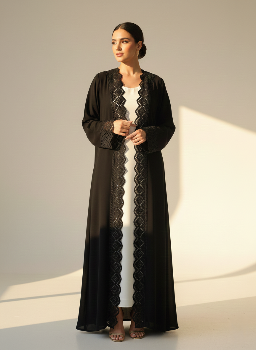 Elevate your wardrobe with the Black Lace Abaya from CAS Abaya, a graceful expression of modern Emirati elegance. Crafted from premium Nada fabric, this abaya offers a lightweight, breathable feel with a smooth, flowing drape. Delicate lace detailing enhances the design, adding femininity and sophistication while maintaining a timeless silhouette.