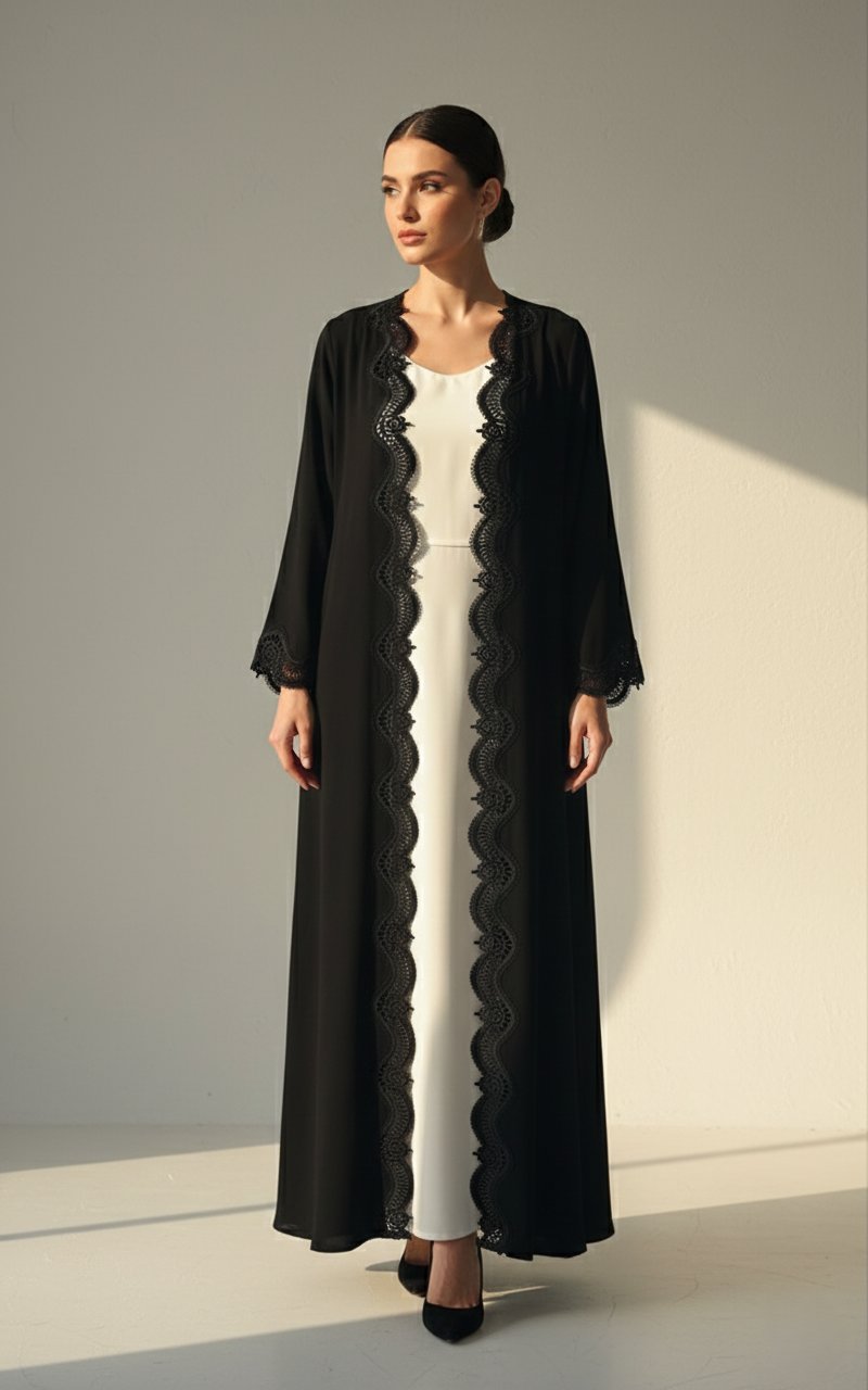 Sophisticated and effortlessly refined, the Black Lace Abaya by CAS Abaya is a celebration of timeless Emirati design. Crafted in classic Emirati abaya style, this abaya is made from premium Nada fabric, known for its lightweight comfort and graceful flow. Elegant lace detailing adds a subtle statement of femininity, enhancing the silhouette with texture and depth.