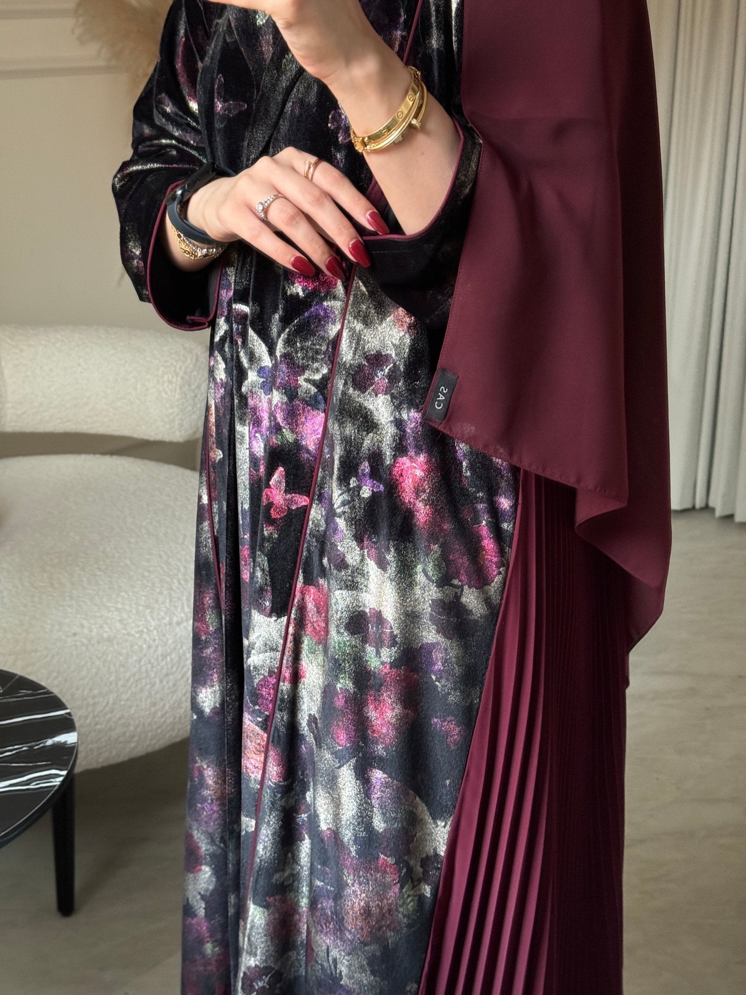 C 0787 - Burgundy Butterfly Velvet Pleated Abaya