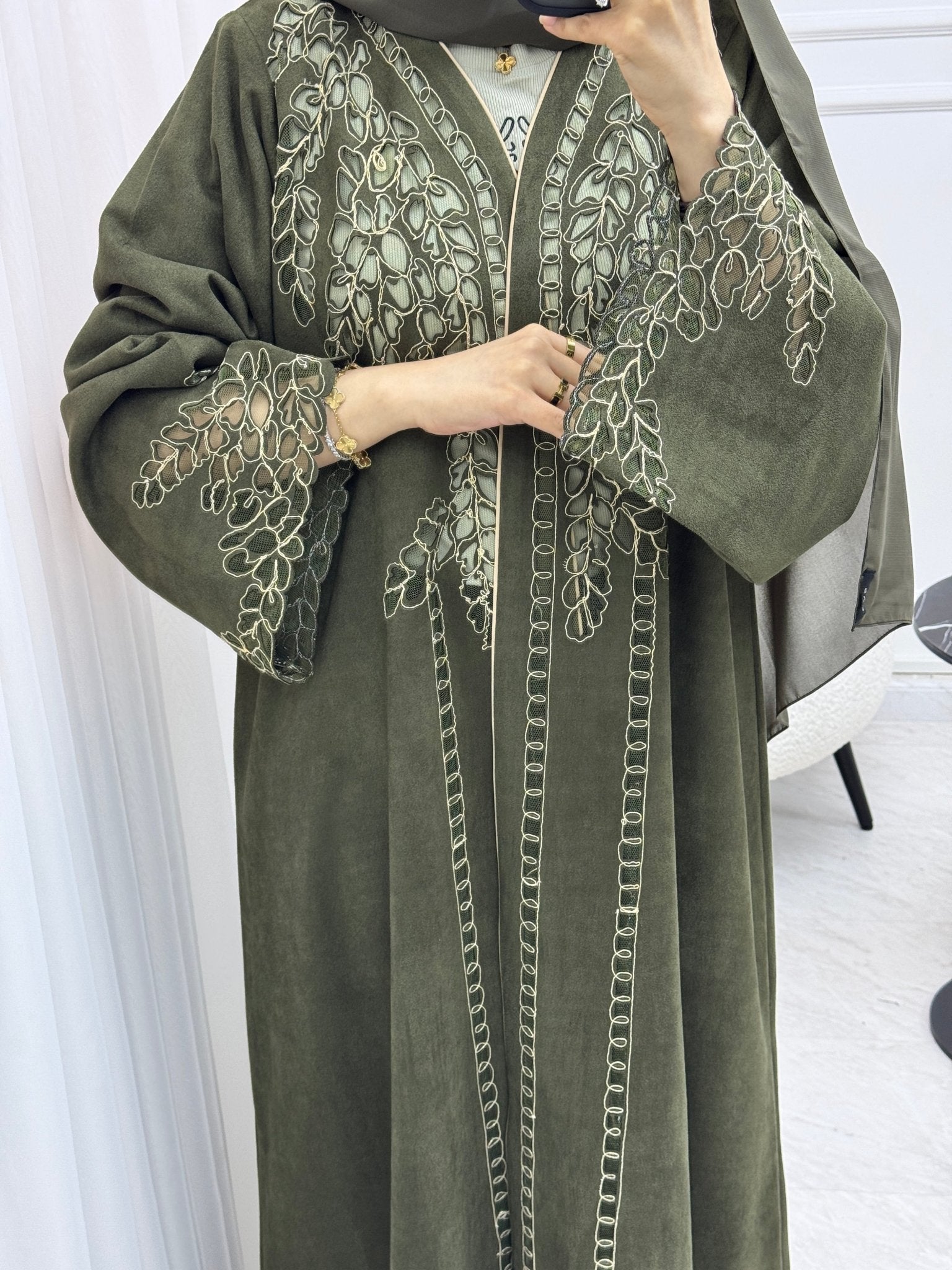 This suede abaya in its rich olive tone, and delicate Lasercut design is not just gorgeous, but a show-stopper. A blend of tradition and modernity, this abaya is the epitome of winter elegance.