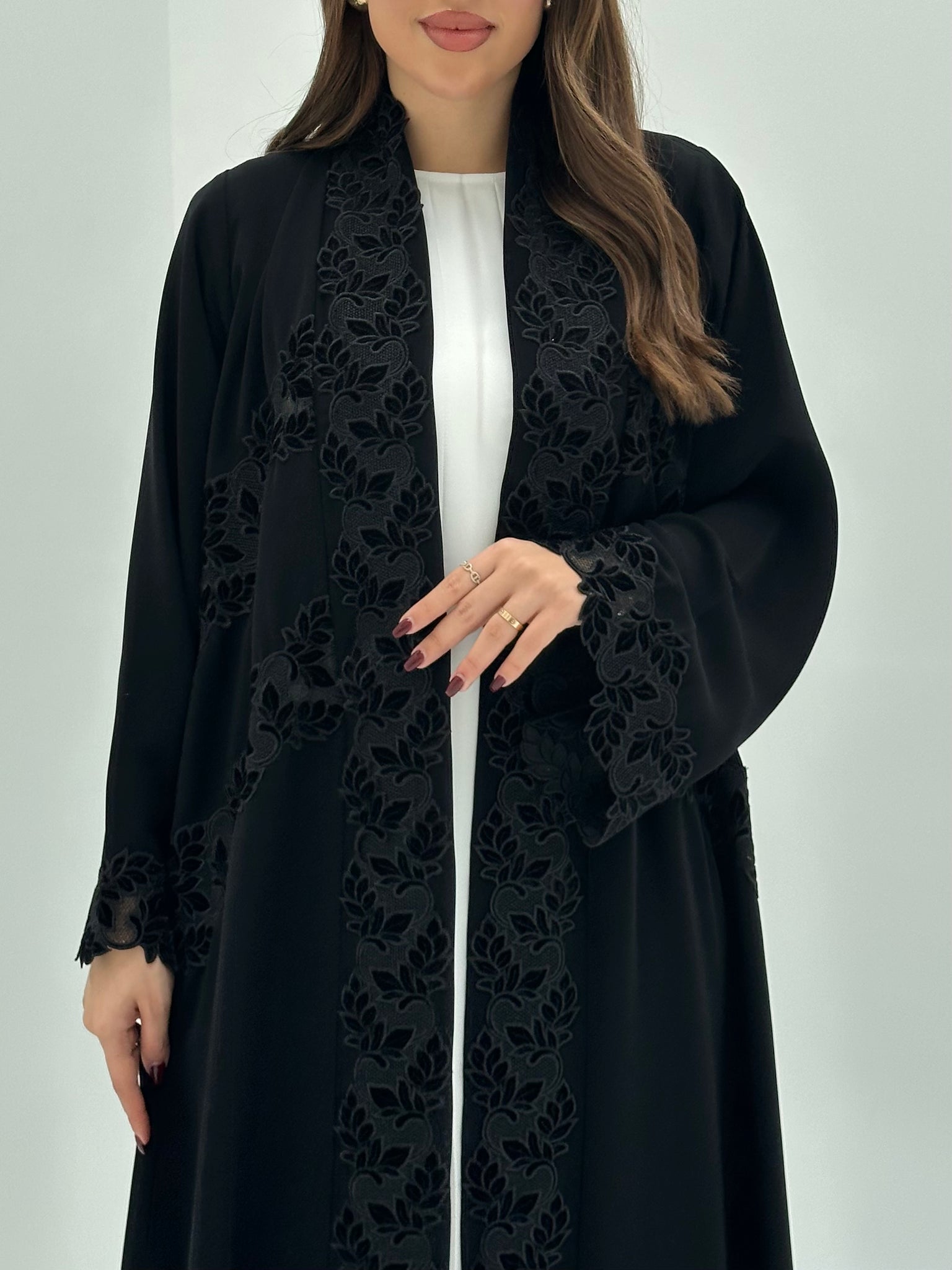 The deep black tone enhances the velvet lace accents, making this abaya an ideal choice for evening wear, Ramadan gatherings, Eid celebrations, formal occasions, and special events. Perfect for women searching where to buy abaya in Dubai, this design balances sophistication, comfort, and timeless style.