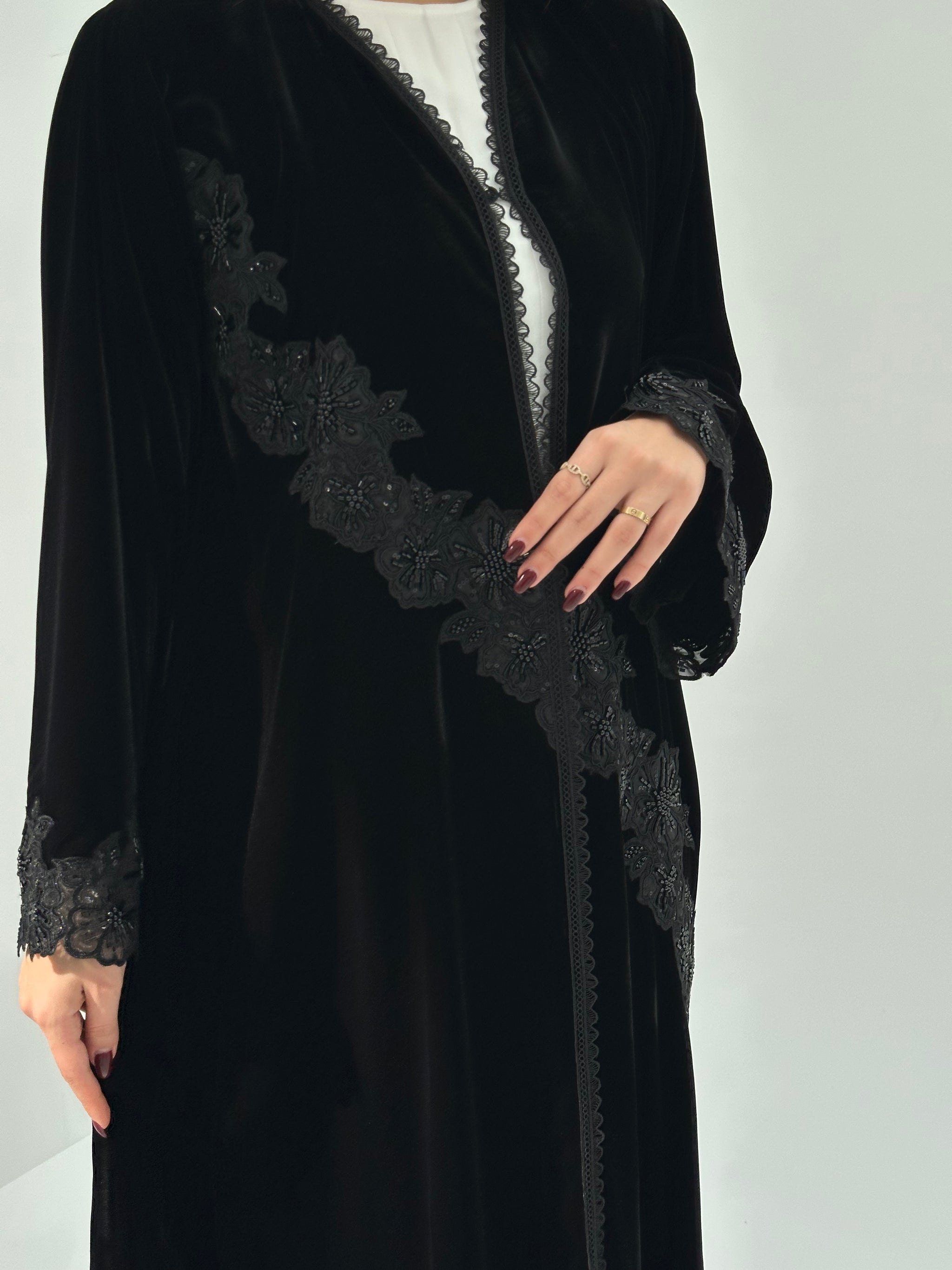 Make a statement with the Black Beaded Lace Abaya, a premium designer piece crafted from luxurious velvet and adorned with intricate beadwork and delicate lace detailing. This abaya exudes elegance and sophistication, making it perfect for Ramadan, Eid, weddings, and upscale events. The soft velvet ensures comfort, while the sparkling beads and lace overlay add a touch of glamour. Ideal for women who love luxury Dubai abayas and high-end modest fashion, this abaya is a timeless addition to any wardrobe.