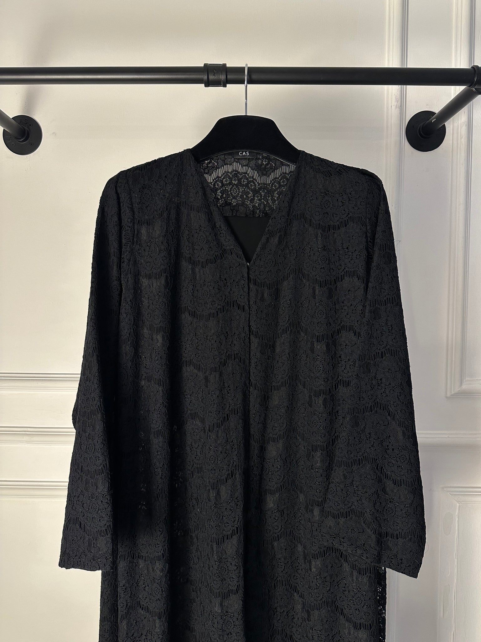 Embrace timeless elegance with the Black Dantel Abaya C 1923 from CAS Abaya, where luxury Dubai abaya craftsmanship meets exquisite lace artistry. This designer abaya UAE showcases premium Dantel fabric with intricate lace detailing that creates a sophisticated and refined look, making it a true signature piece for the modern Emirati woman who appreciates delicate modest fashion.