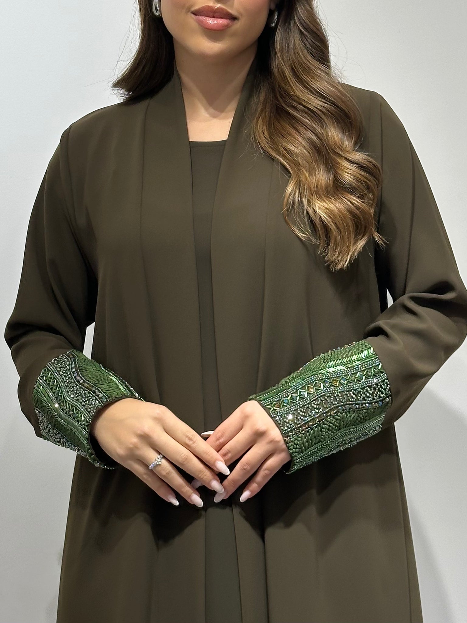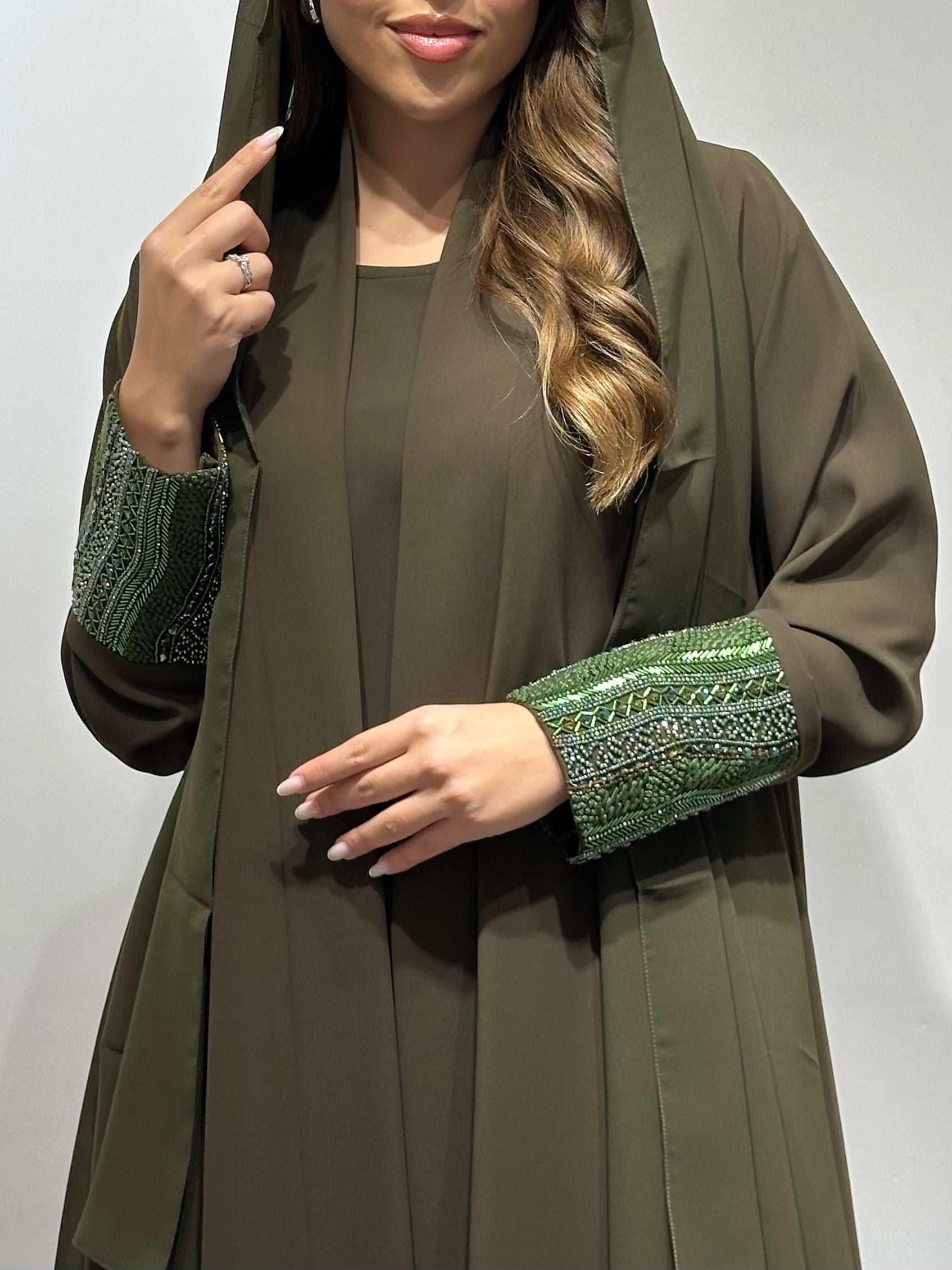 Delicately hand-beaded embellishments accentuate the abaya, adding just the right amount of sparkle for both everyday sophistication and special occasions. The soft olive tone brings a refreshing twist to traditional black abayas, making it ideal for women who love subtle color with luxury craftsmanship.