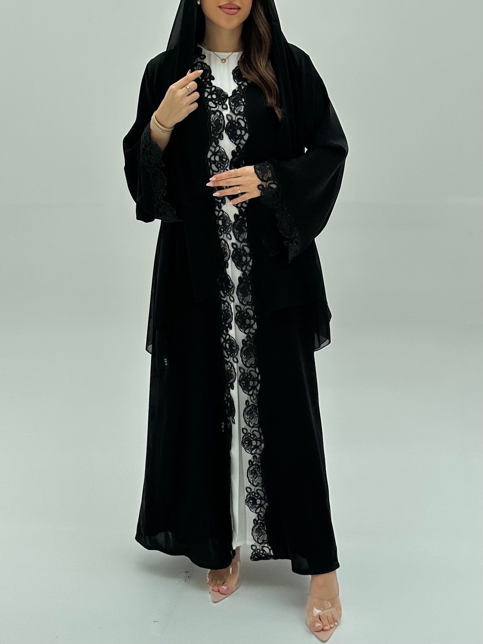 The finest Nada fabric forms the foundation of this luxury abaya UAE, offering an impeccable drape and silhouette-flattering flow. Meticulously placed crystals complement the intricate lace patterns, reflecting light in mesmerizing ways that honor Emirati heritage while embracing modern glamour. This signature Dubai abaya stands as a testament to exceptional craftsmanship and contemporary elegance.