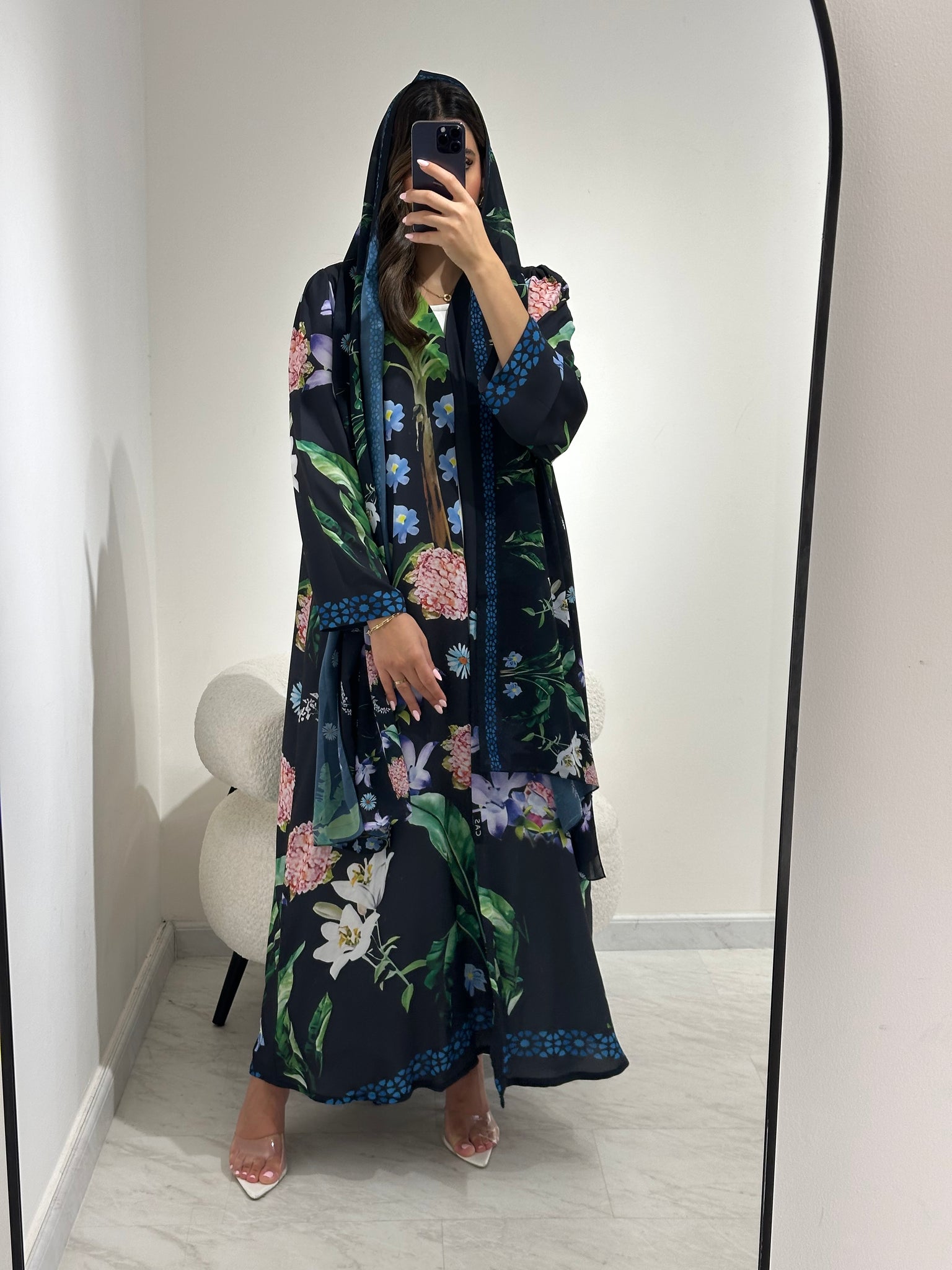 A few enhancements carry a small fee: for example, adding a full lining (batana) under the abaya is AED 70, adding an extra chiffon layer is AED 100, and extending the sheila beyond the standard length costs AED 40. We’ll always tell you about any charges before completing your order.