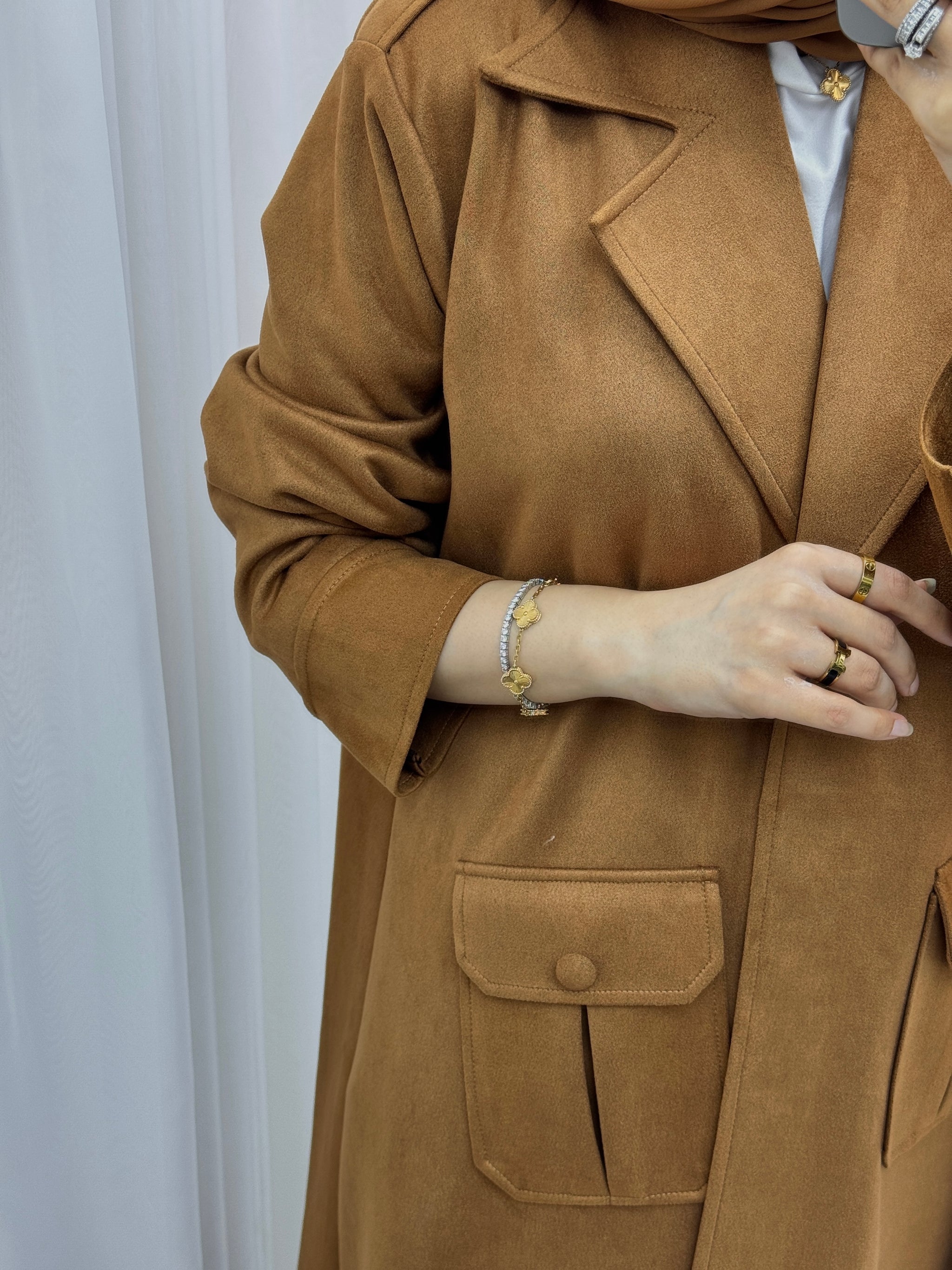 Rich, bold, and effortlessly refined — the Copper Coat Abaya in Velvet Suede is a statement of timeless sophistication. Crafted from premium velvet suede fabric, this abaya offers a soft, plush texture with a structured coat-style silhouette that radiates confidence and luxury.