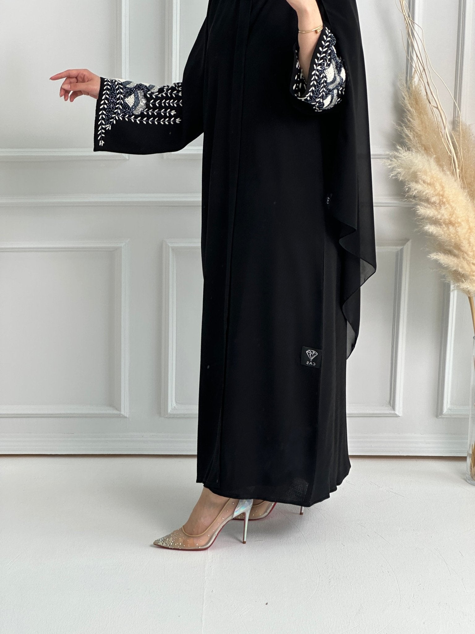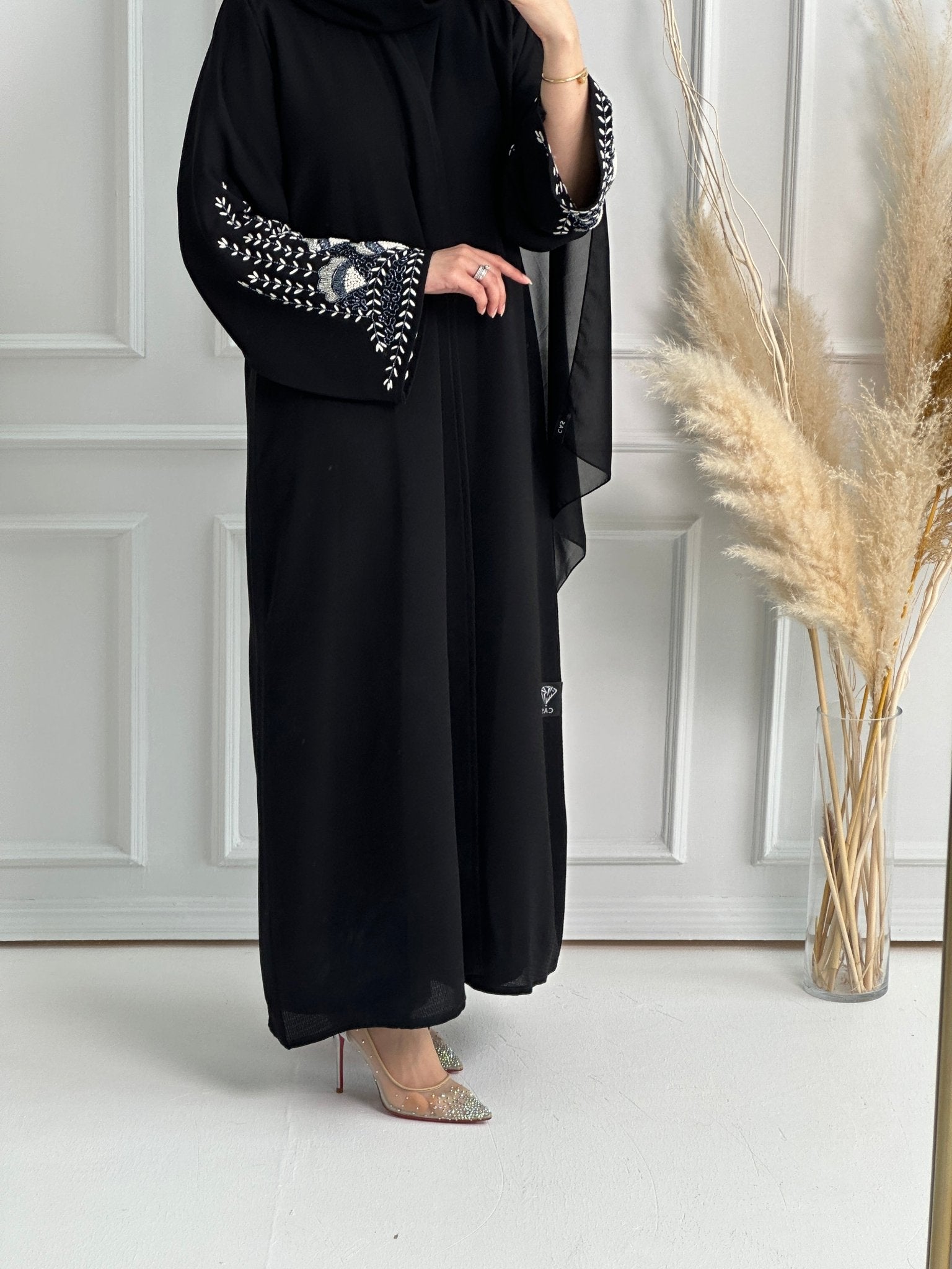 An opulent black abaya with intricate white & silver beadwork adorning the straight sleeves alludes to traditional bisht style.