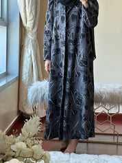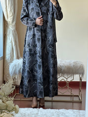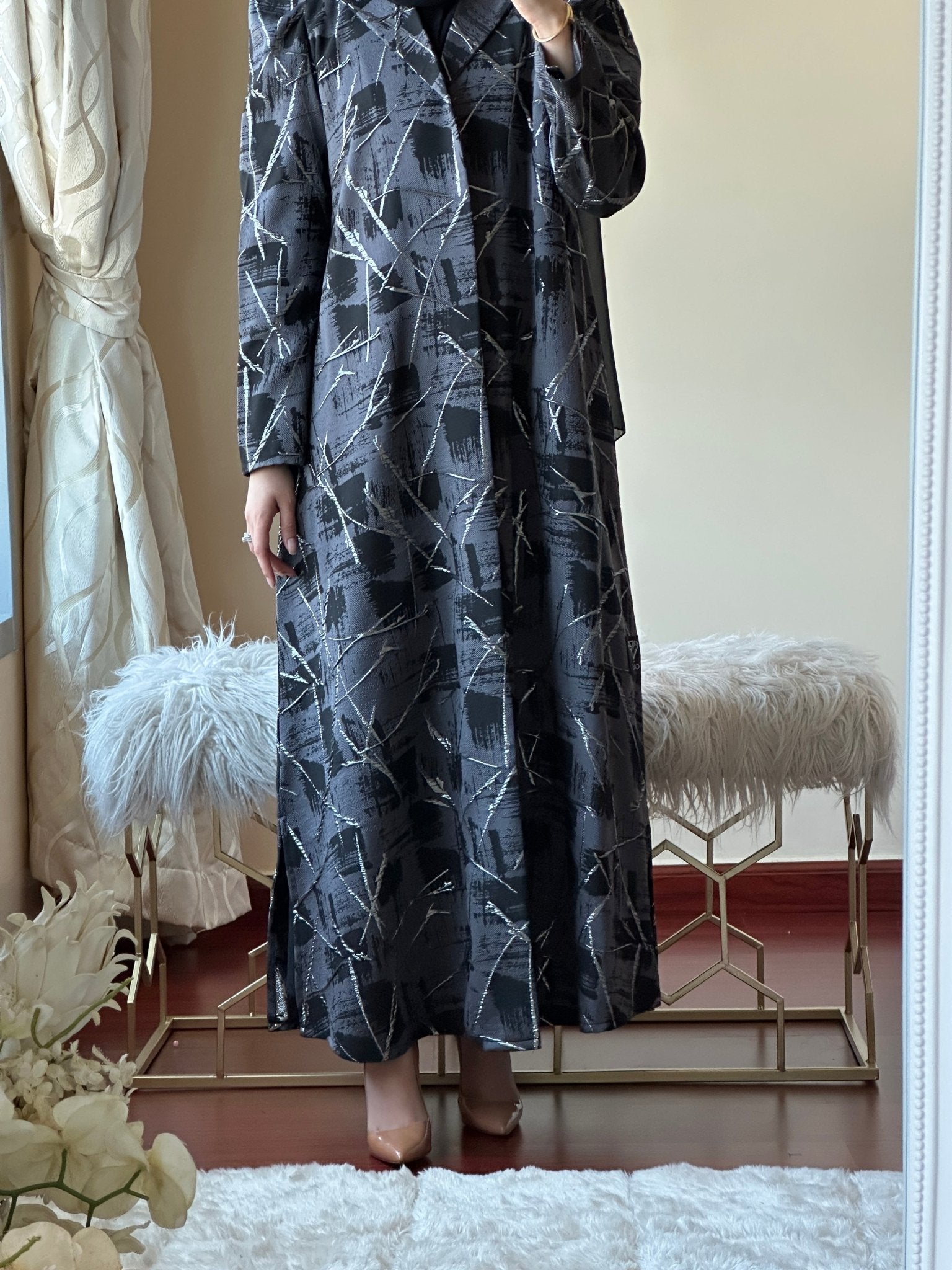 The perfect blend of sophistication and comfort. This grey coat style abaya features a unique black and silver paint stroke design, puffed shoulders, and straight cuffed sleeves for a tailored and sophisticated look.