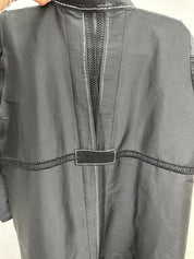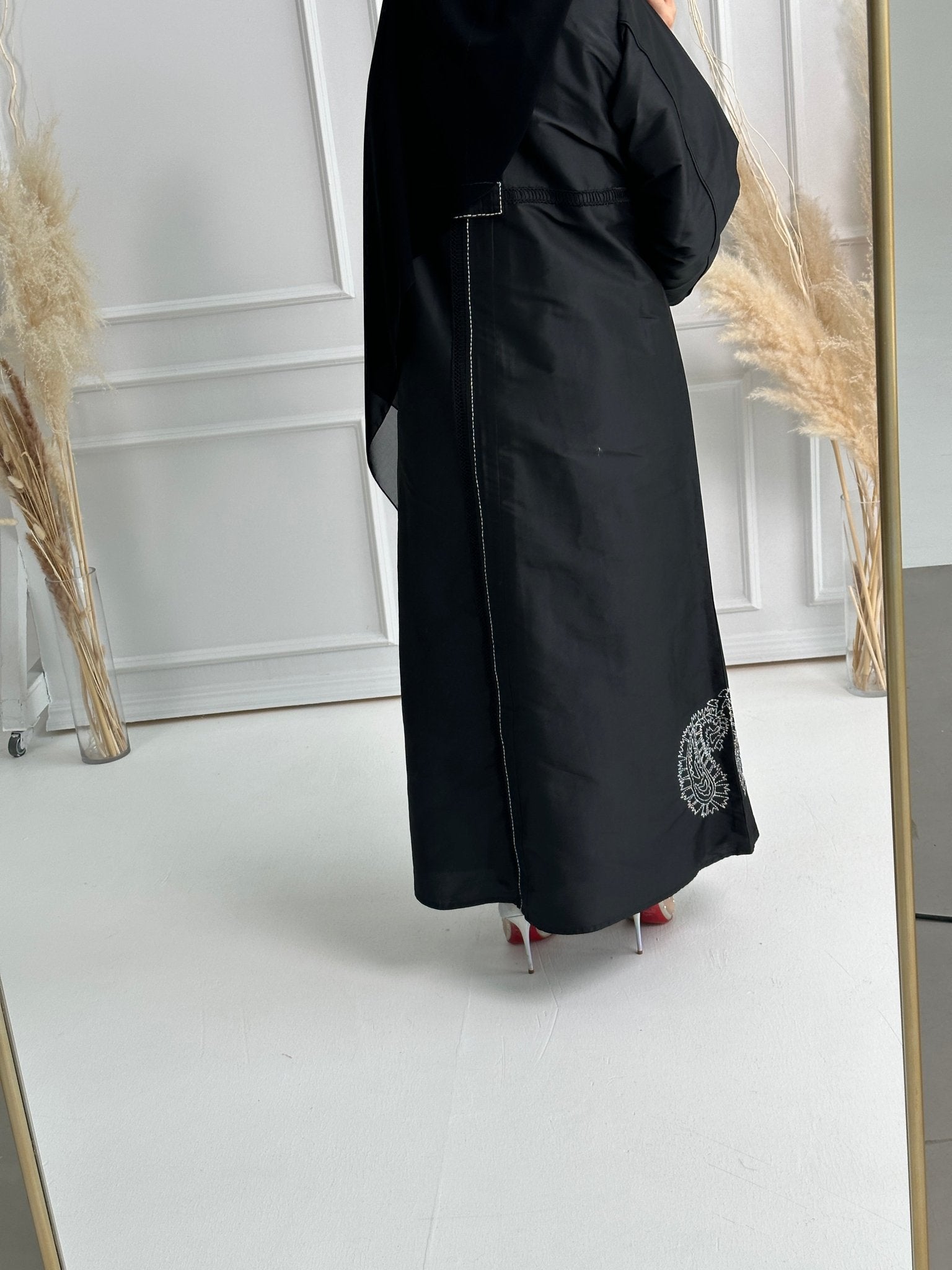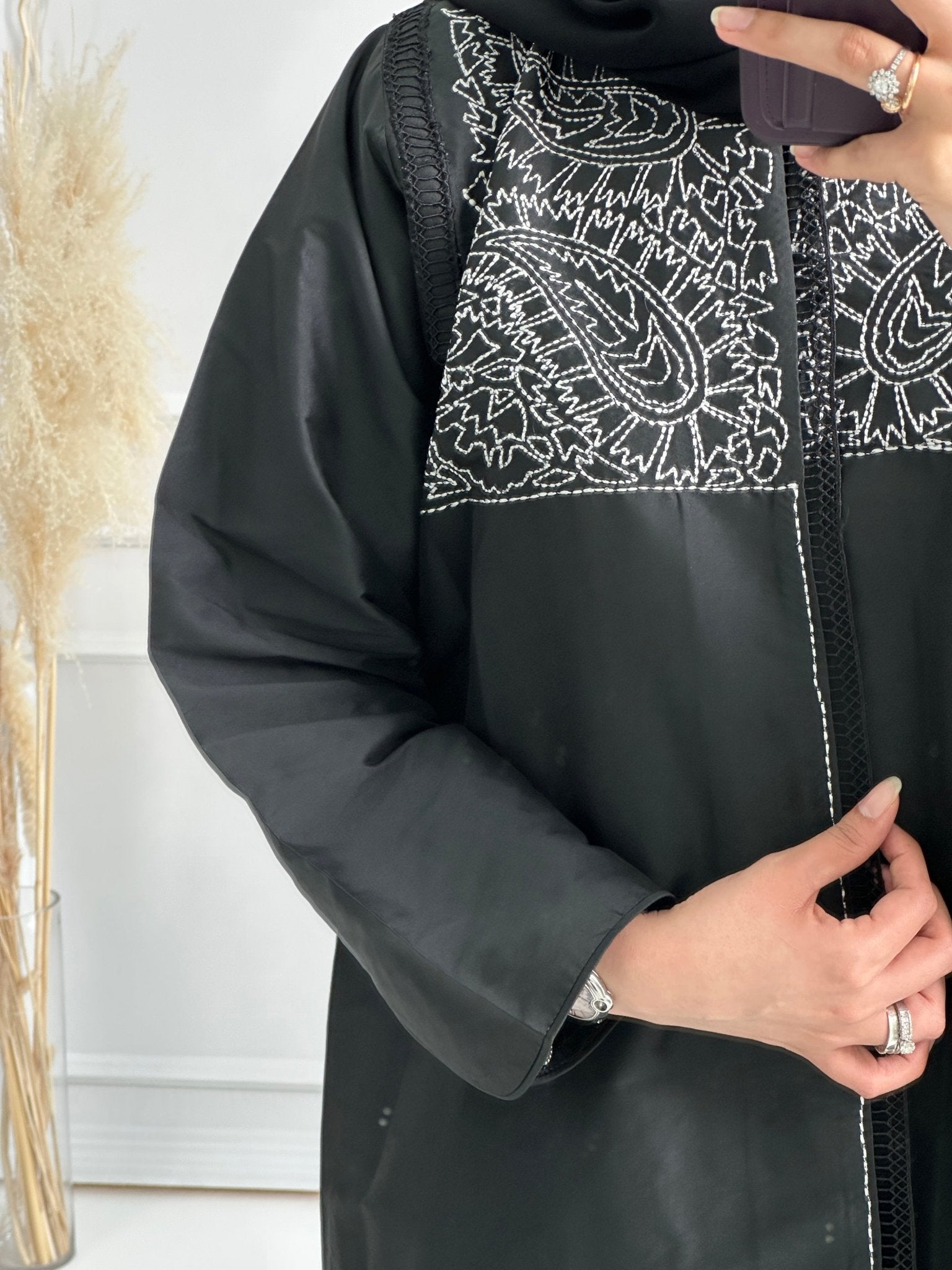 This sleek taffeta abaya gleams with white paisleys decorating the front & detailed embroidery adorning the back.