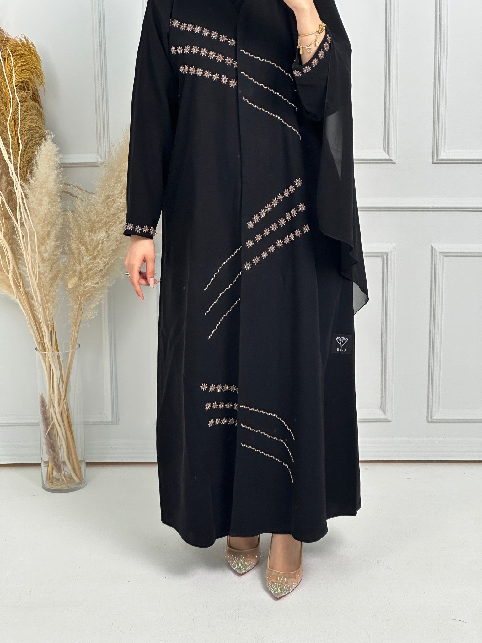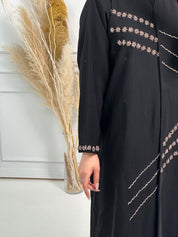This straight cut abaya features elegantly placed rose gold beadwork along the sleeves and entire front.