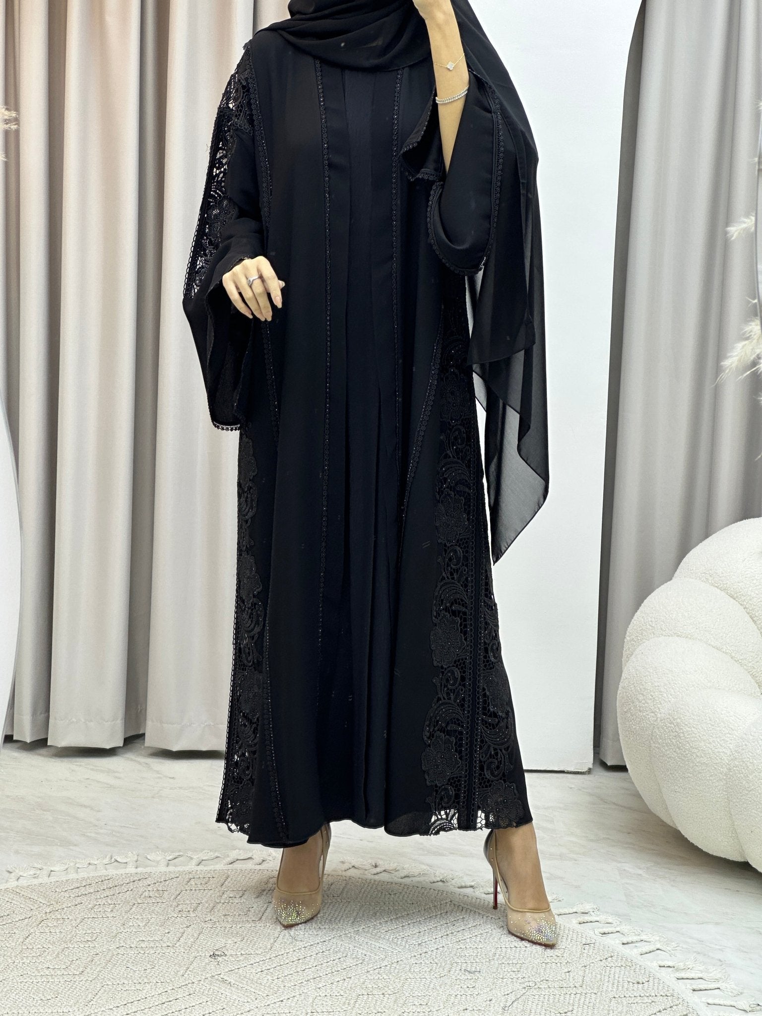 Experience tasteful elegance with the C Classic Lace Work Abaya Set, featuring a straight cut and delicate lacework on the shoulders. Oversized sleeves bring comfort and sophistication to the classic black of the nada fabric, for an elegant, timeless look.