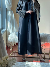 Coat style bridal satin abaya with contrasting embroidered sleeves.