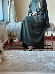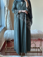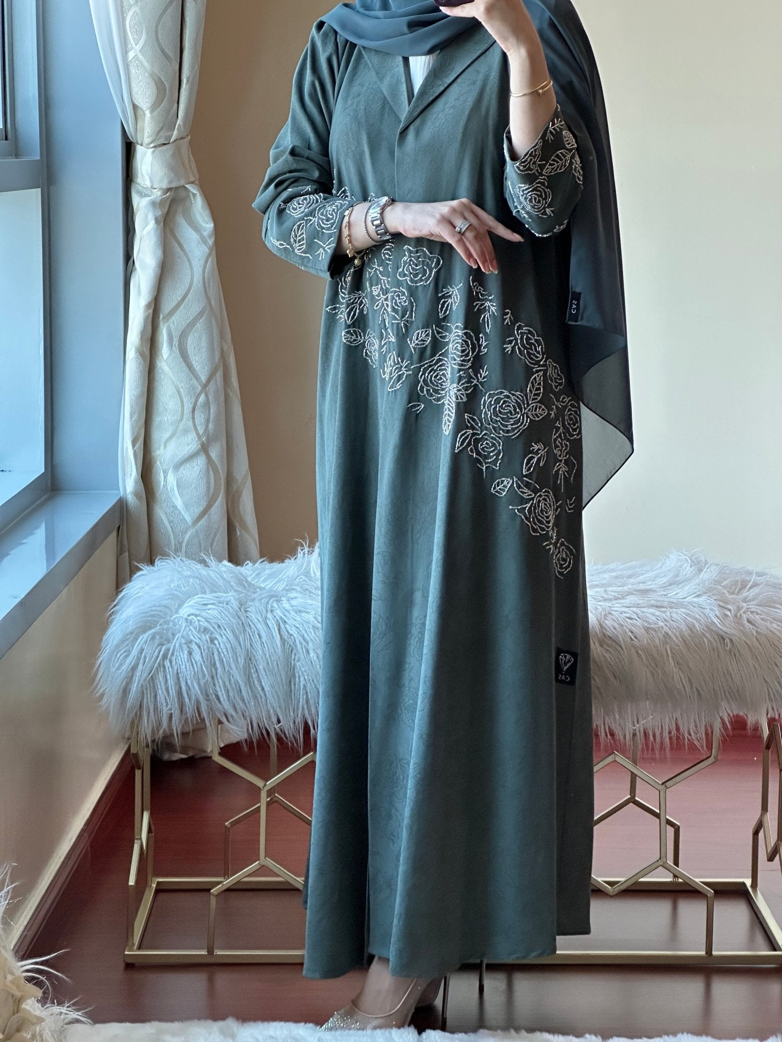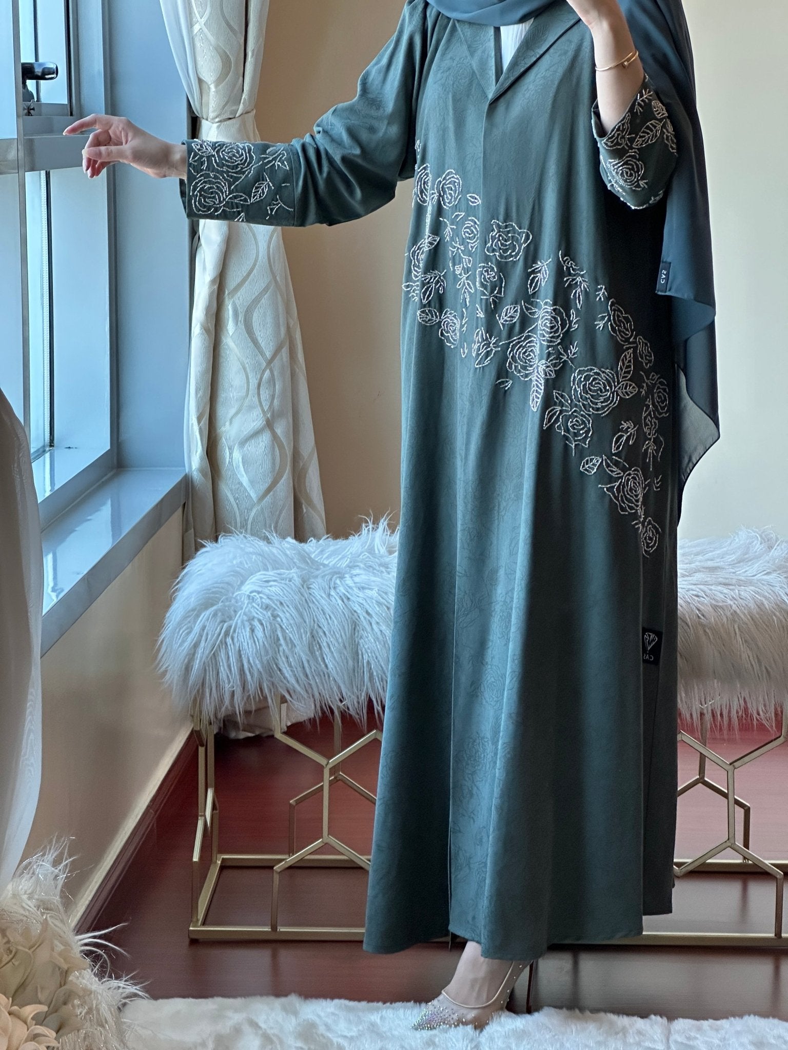 Coat style green floral print abaya with diagonally shaped silver beadwork and cuffed sleeves.