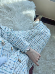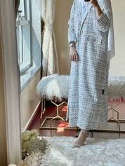 Winter Collection: White/Light Blue double-breasted coat style tweed abaya with front pockets and folded cuff sleeves.