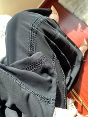Straight cut kloosh abaya with panels of beaded lacework and straight French sleeves.
