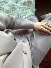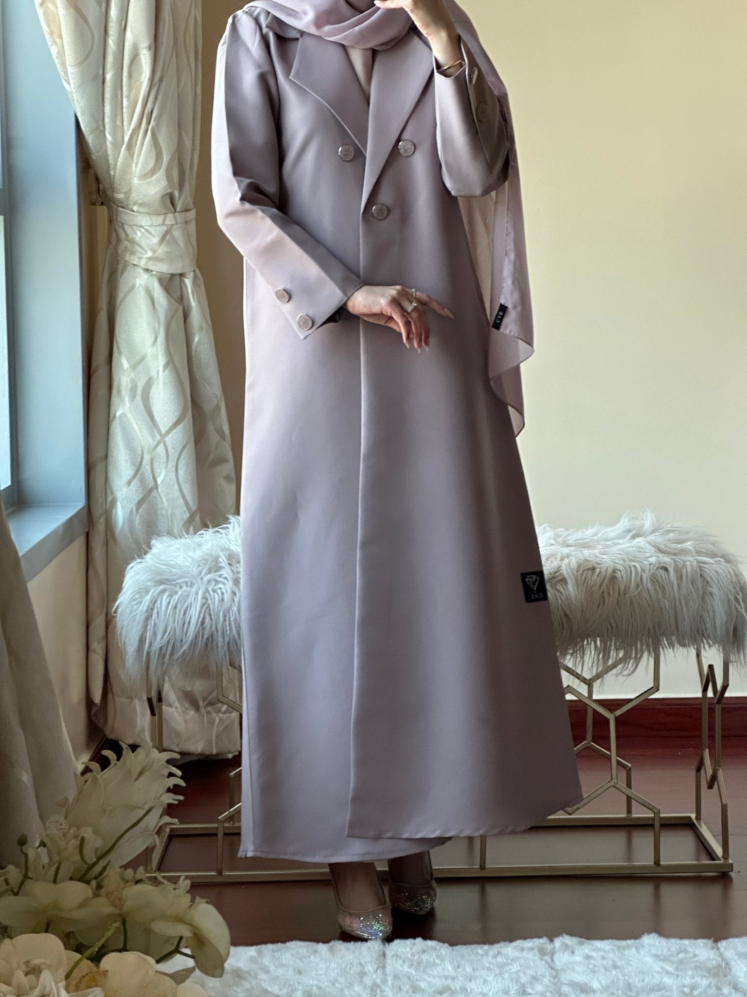 Luxurious beige coat style abaya featuring an oversized-buttoned silhouette, puffed shoulders, and cuffs on the sleeves.