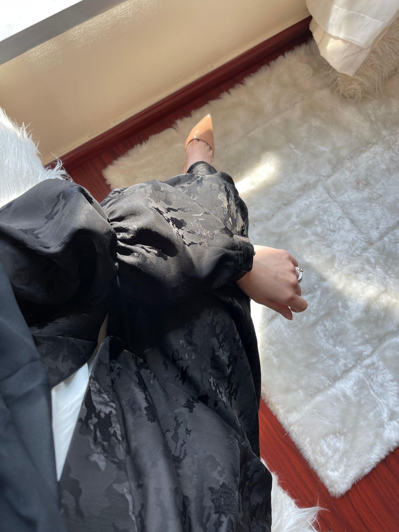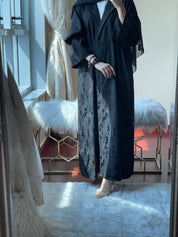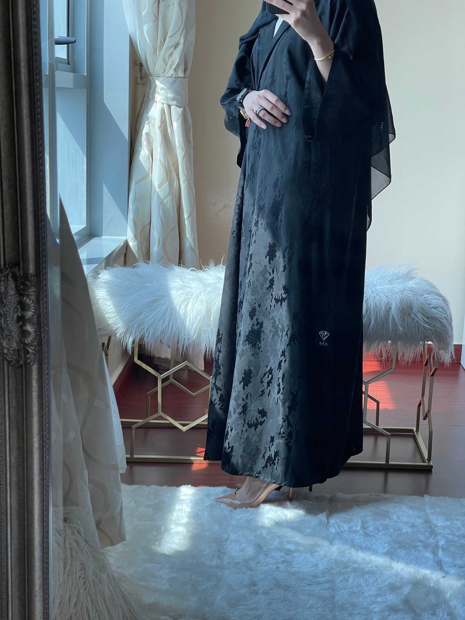 Black coat-style marble print work abaya with elastic umbrella sleeves.