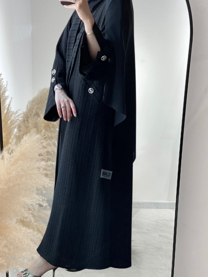 Black oversized coat - style flowy abaya with extended collar and buttoned sleeves.