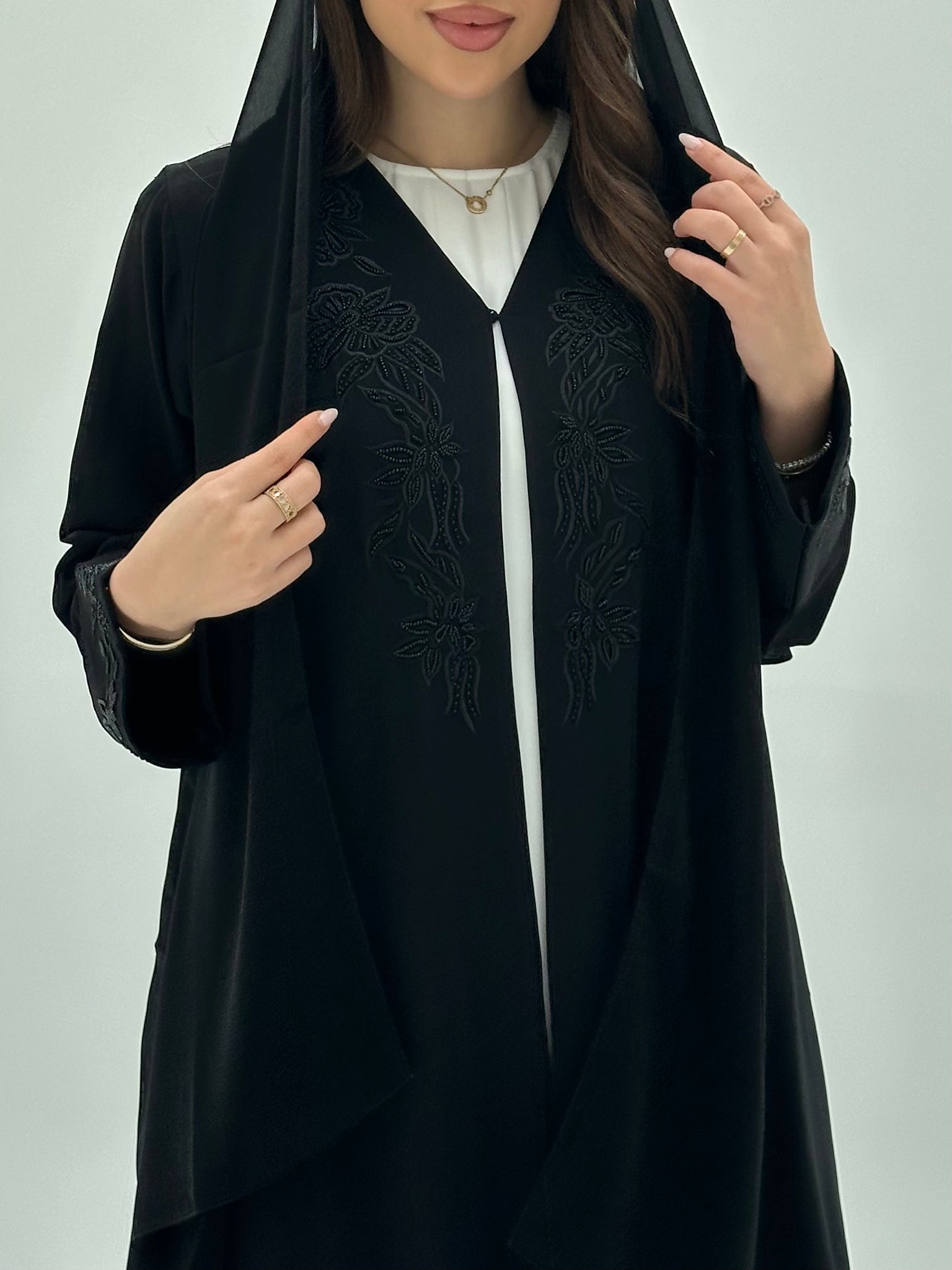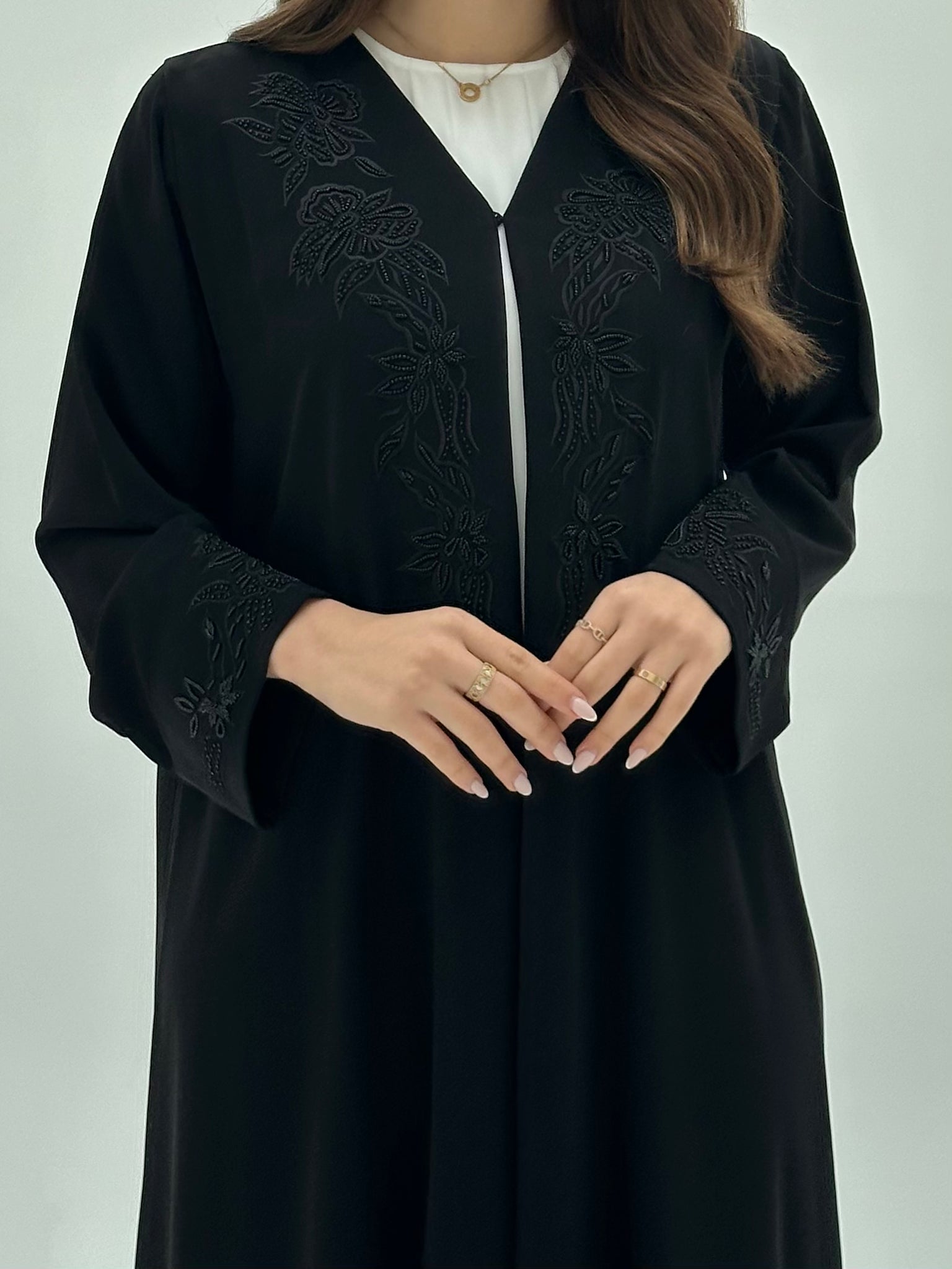 Embrace botanical elegance with the Black Floral Beaded Abaya C 1939 from CAS Abaya, where nature-inspired beadwork blooms across premium Crepe fabric. Delicate floral patterns are brought to life through intricate beading that adds dimension and romance to this designer abaya UAE. Perfect for the elegant Emirati abaya lover who seeks a harmonious blend of organic beauty and sophisticated embellishment in her modest fashion collection.