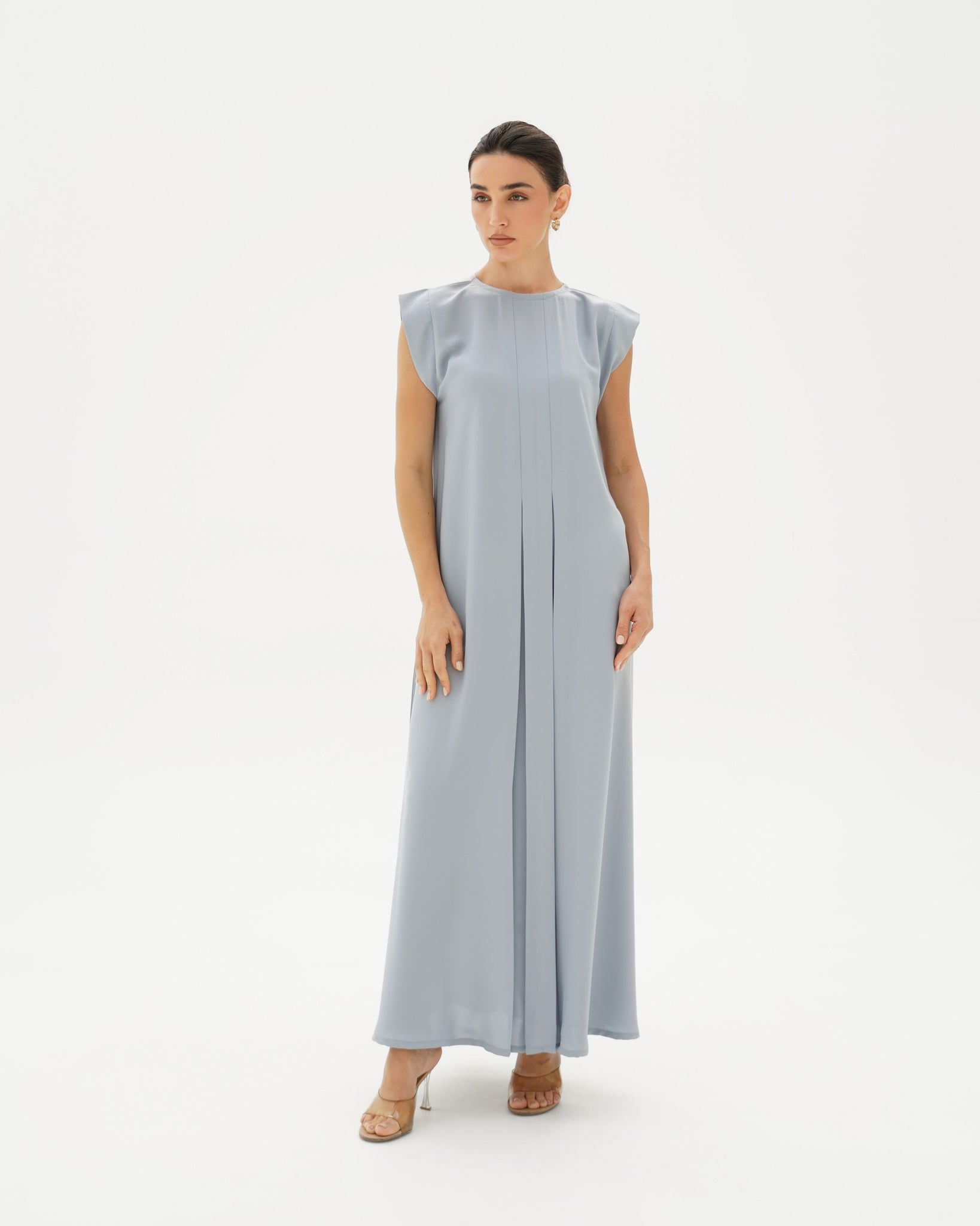 Enhance your abaya styling with our Premium Sky Blue Pleated Under Abaya Dress, designed specifically to be worn as a comfortable inner dress under abayas. Crafted from breathable premium crepe, it features elegant pleated detailing that ensures a smooth, flattering layer without bulk.