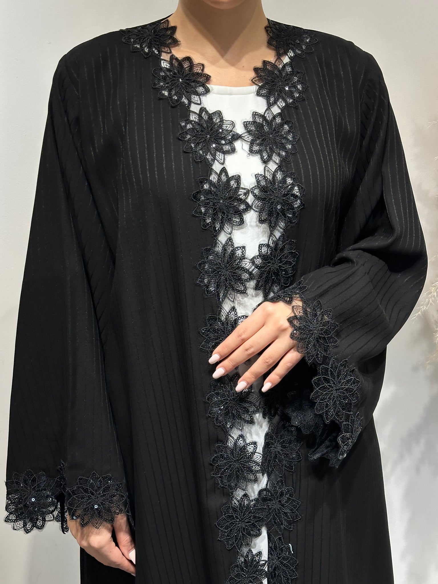 Make a statement with our Black Floral Lace Abaya crafted from soft jacquard fabric. Featuring intricate floral lace detailing, this abaya combines elegance and modern modest fashion. Its flowing silhouette ensures comfort while adding a sophisticated touch to any occasion, from formal events to festive gatherings. Shop with confidence at the best affordable abaya shop in Dubai and enjoy high-quality abayas at unbeatable prices.
