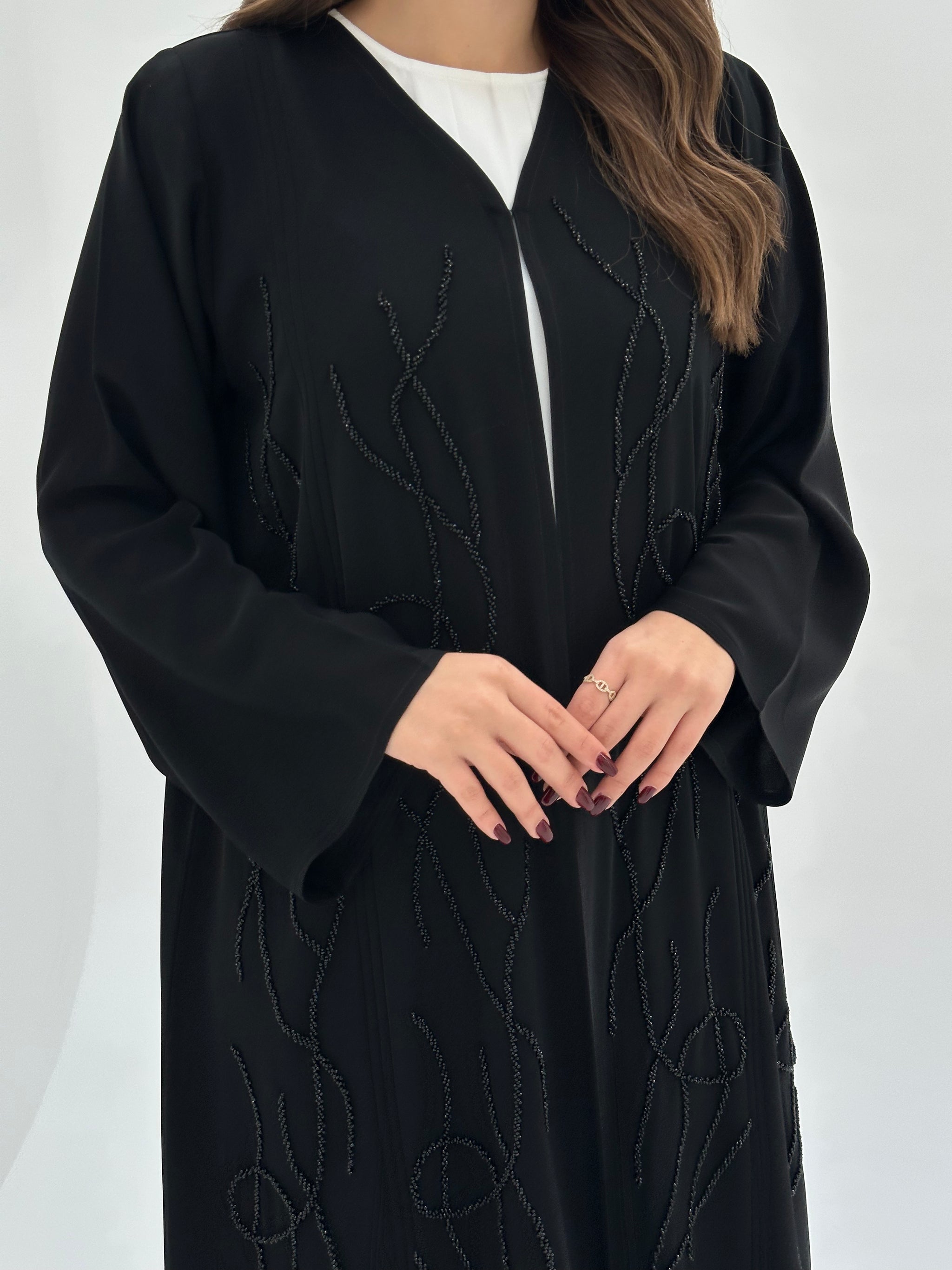 Delicate bead embellishments add a luxurious touch, making it a standout luxury abaya Dubai women admire. Inspired by classic Emirati abaya style, it features a modern abaya Dubai silhouette suitable for formal occasions and special gatherings.