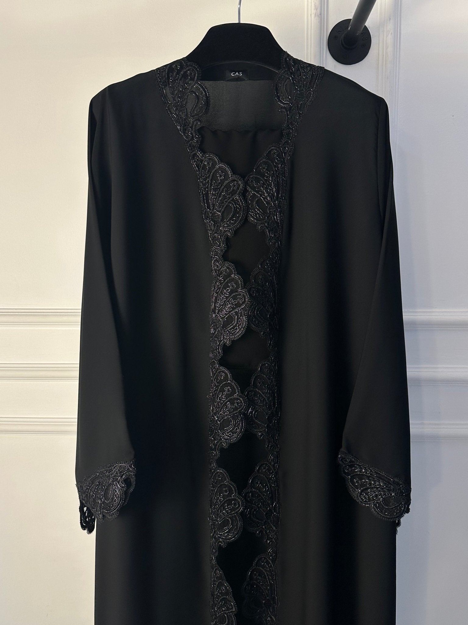 Elevate your wardrobe with the Black Lace Abaya from CAS Abaya, a graceful expression of modern Emirati elegance. Crafted from premium Nada fabric, this abaya offers a lightweight, breathable feel with a smooth, flowing drape. Delicate lace detailing enhances the design, adding femininity and sophistication while maintaining a timeless silhouette.