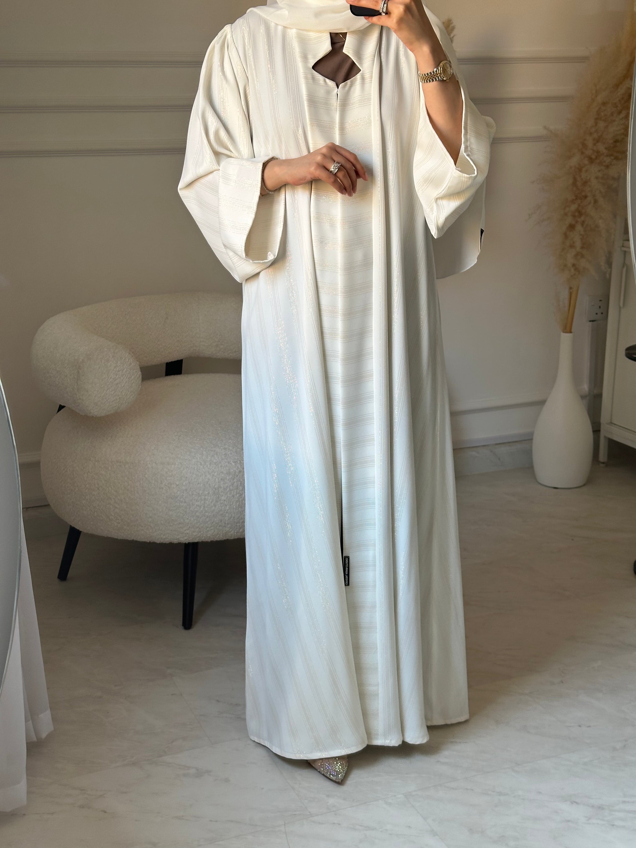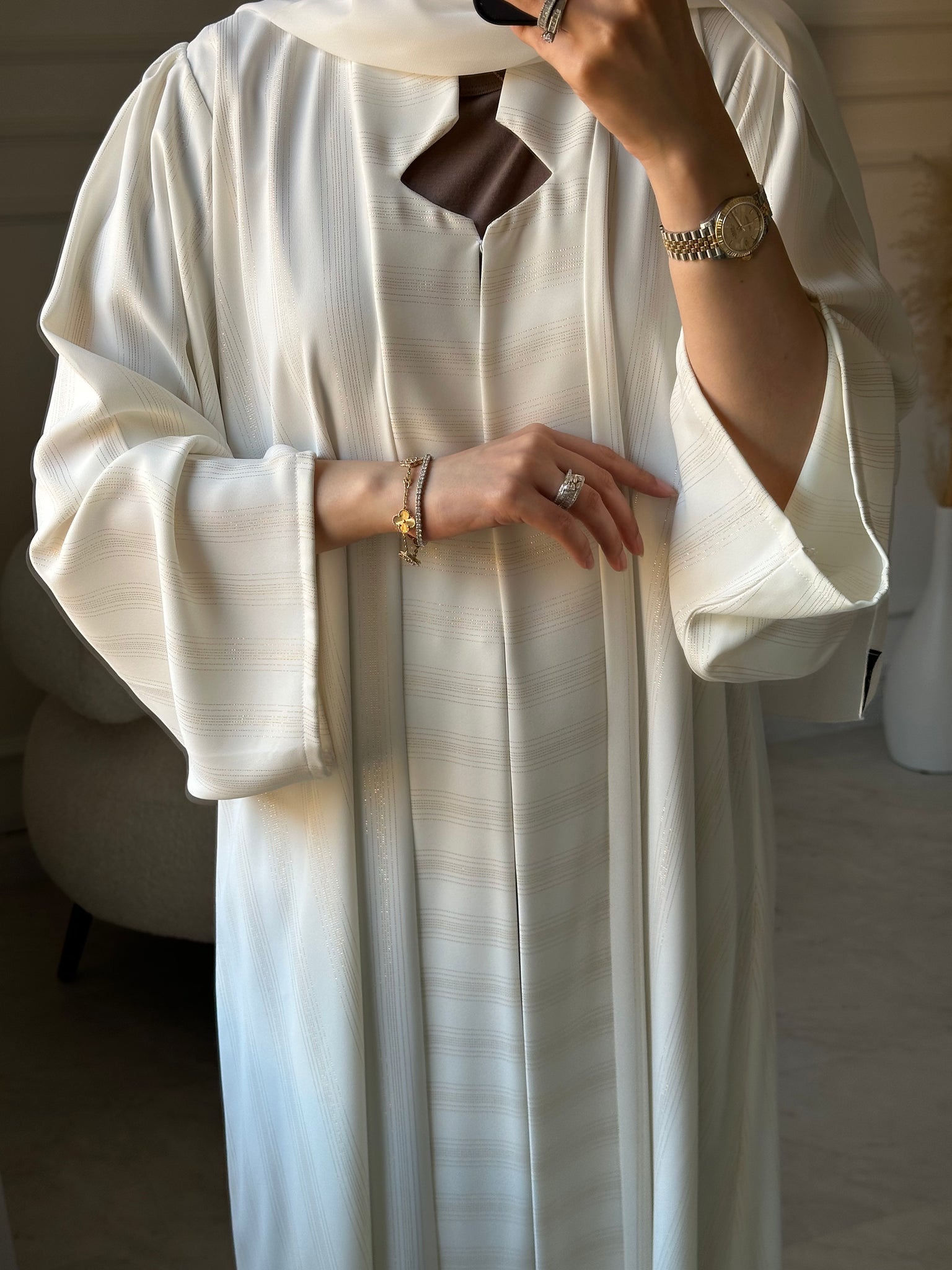 Elegant and timeless, the White Abaya in Soft Jacquard is crafted for women who embrace modest fashion with a touch of luxury. Made from premium soft jacquard fabric, this abaya features a subtle textured finish that enhances its classic white tone, giving it depth and sophistication.