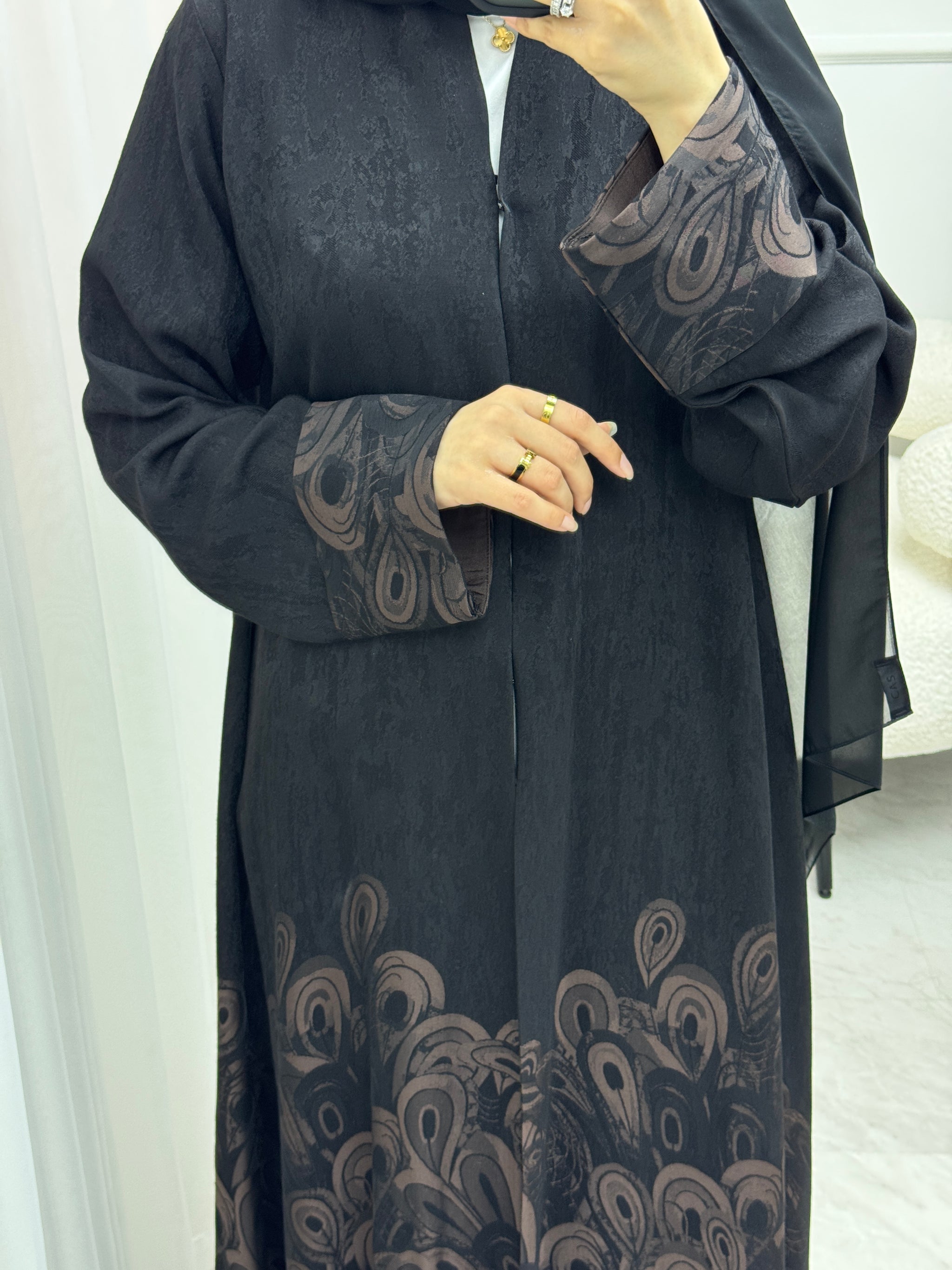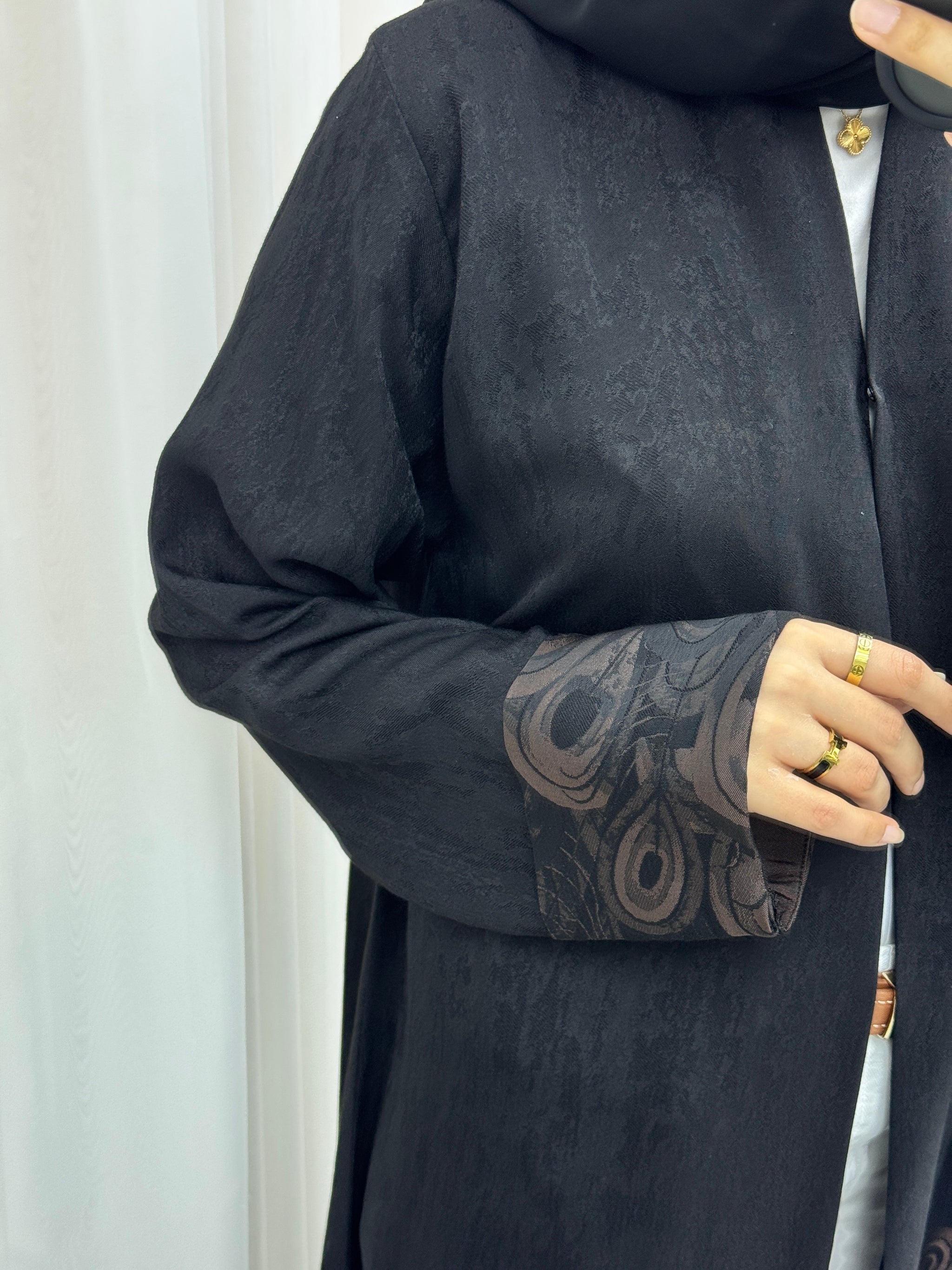Modern and elegant, the Black Printed Abaya in Jacquard is a masterpiece of subtle texture and timeless design. Made from premium soft jacquard fabric, this abaya features a rich black base enhanced with refined printed detailing, creating a perfect balance between understated charm and contemporary sophistication.