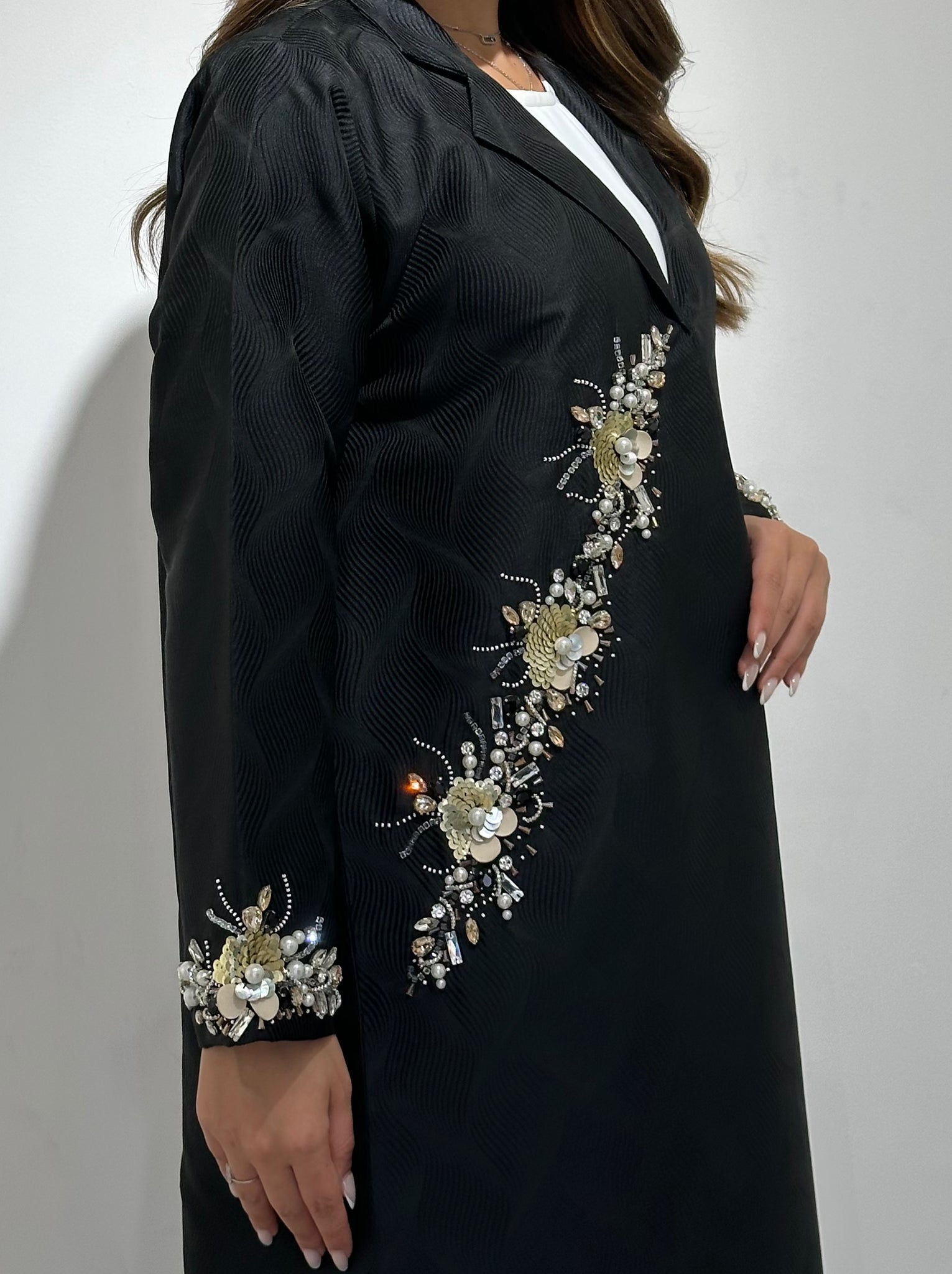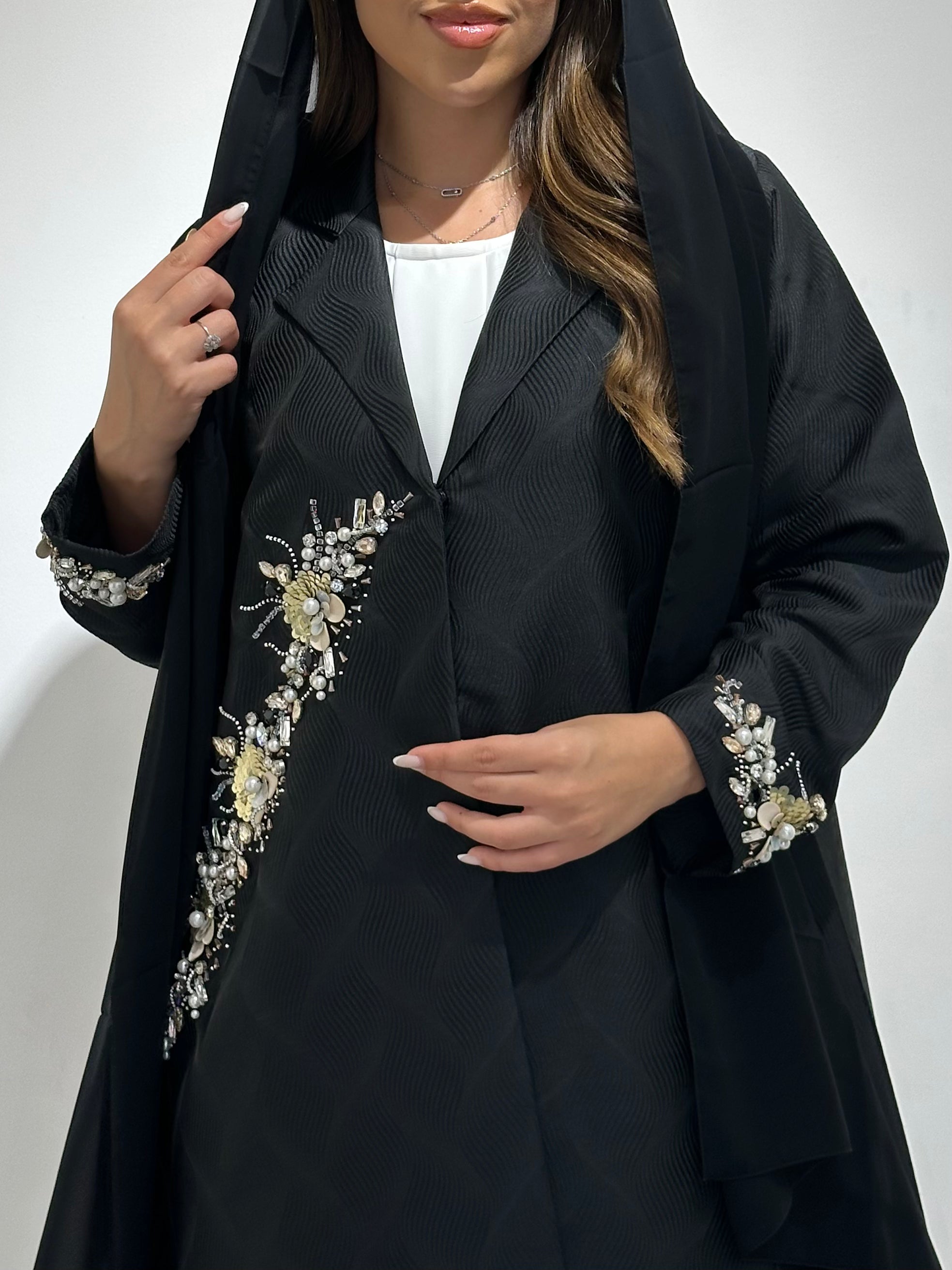 Elevate your modest wardrobe with the Black Floral Beaded Abaya, crafted from premium jacquard fabric and adorned with intricate beadwork for a luxurious, elegant finish. Perfect for formal events, office wear, Ramadan, or Eid celebrations, this abaya blends classic modesty with contemporary style.