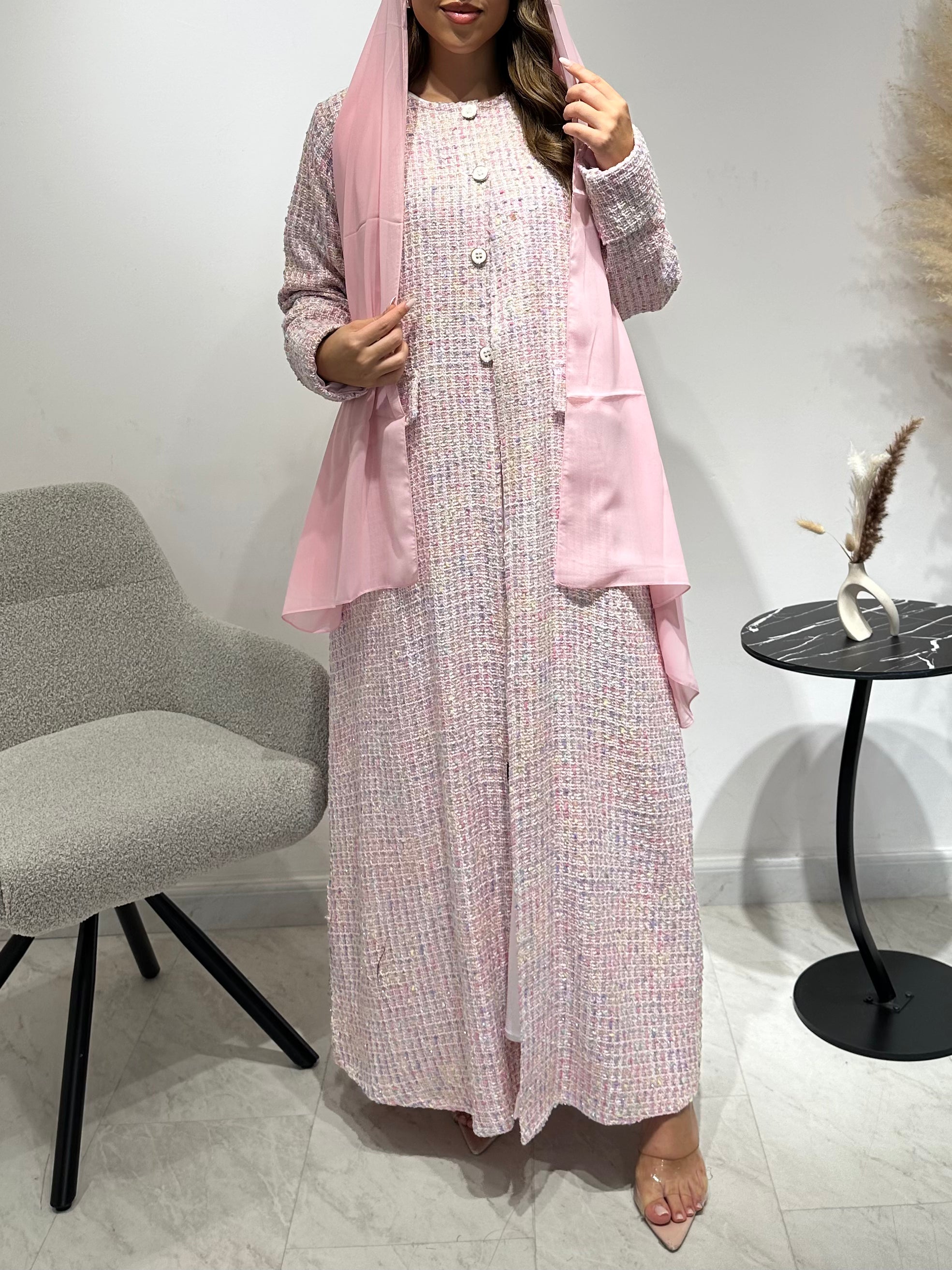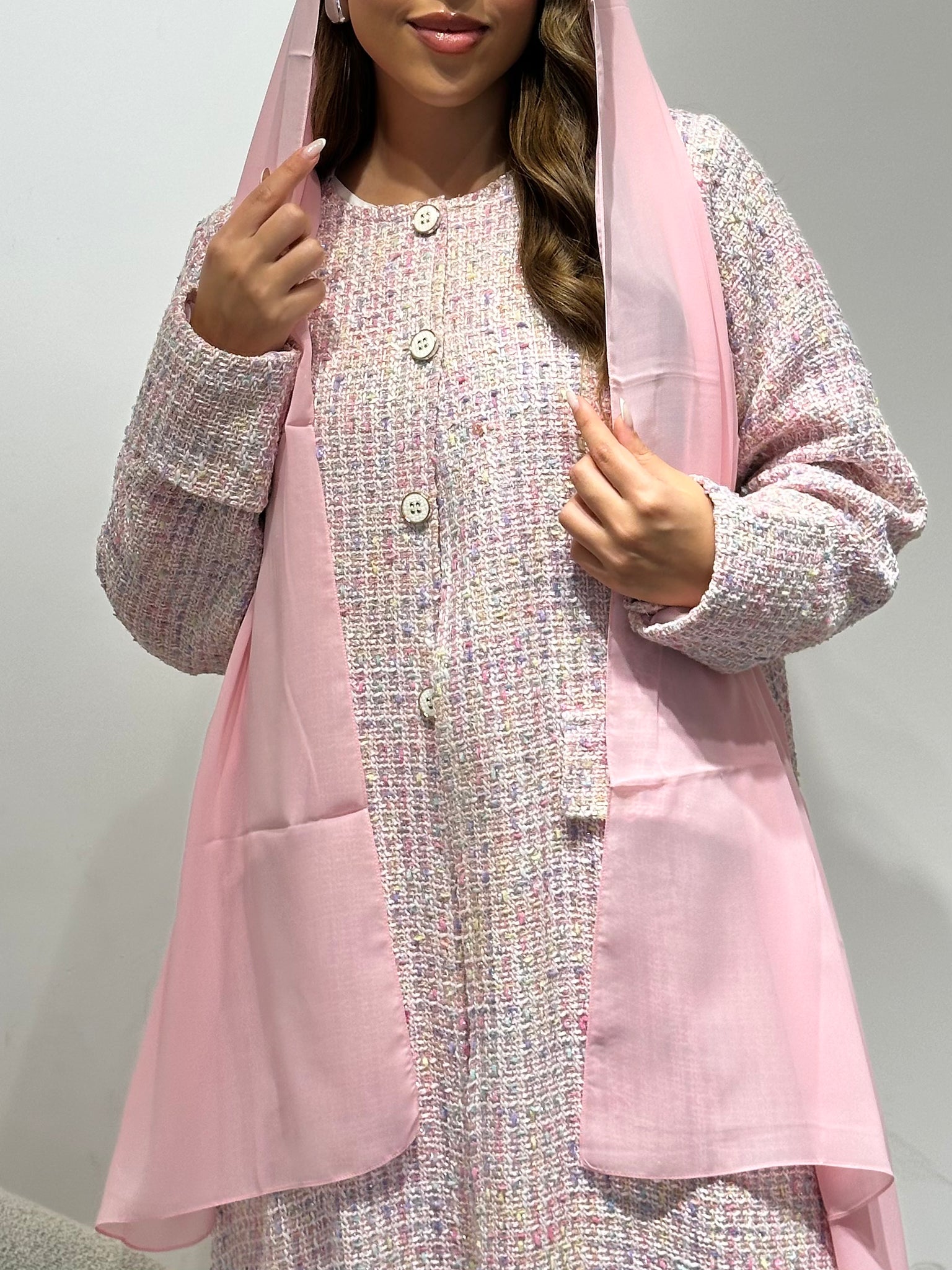 Radiate soft elegance with our Baby Pink Tweed Abaya, a refined blend of classic design and modern modest fashion. Crafted from premium tweed fabric, this abaya offers a graceful drape and a subtle texture that exudes sophistication. The gentle baby pink shade adds a feminine charm, perfect for daytime outings, business events, or evening gatherings.