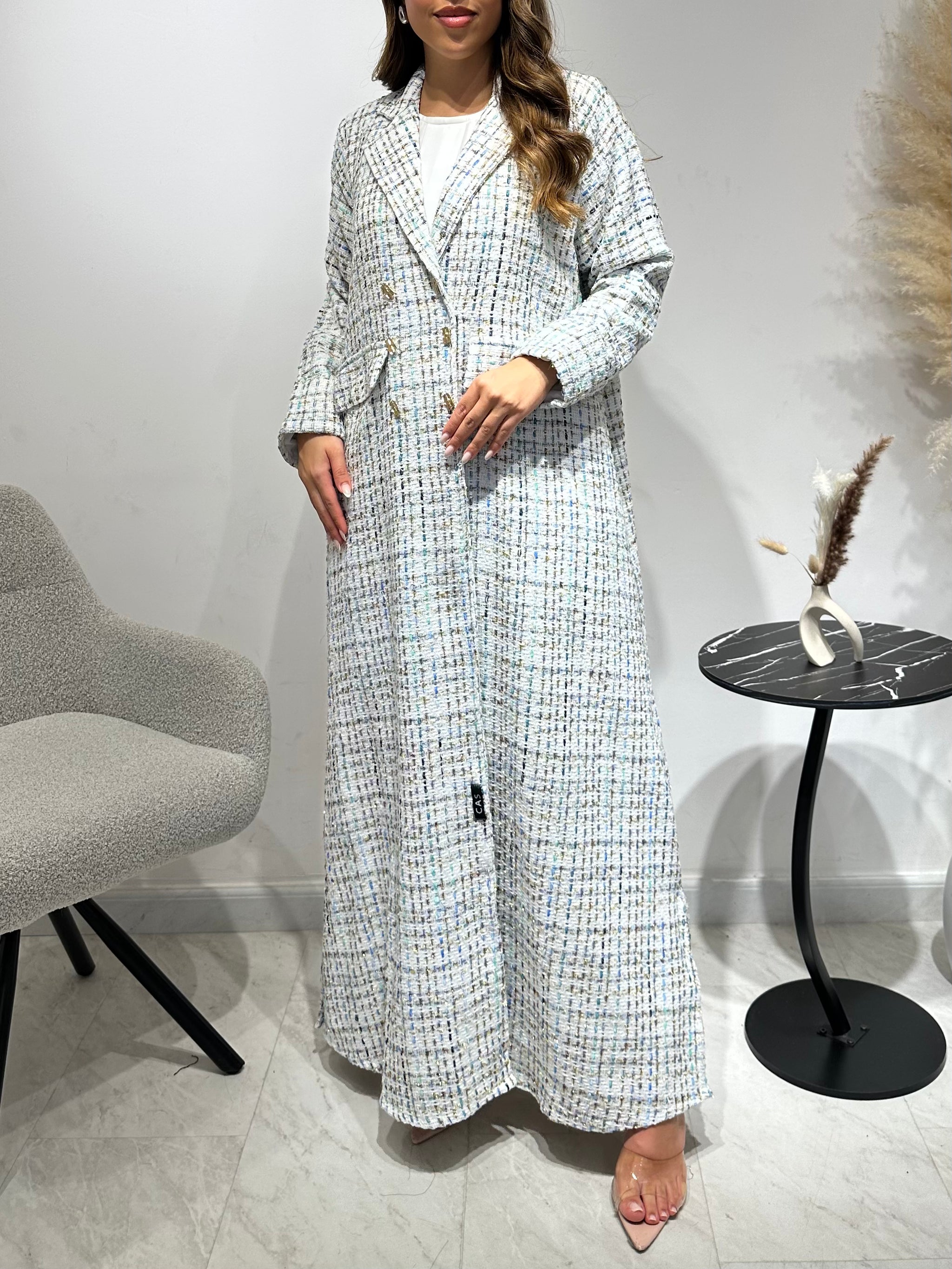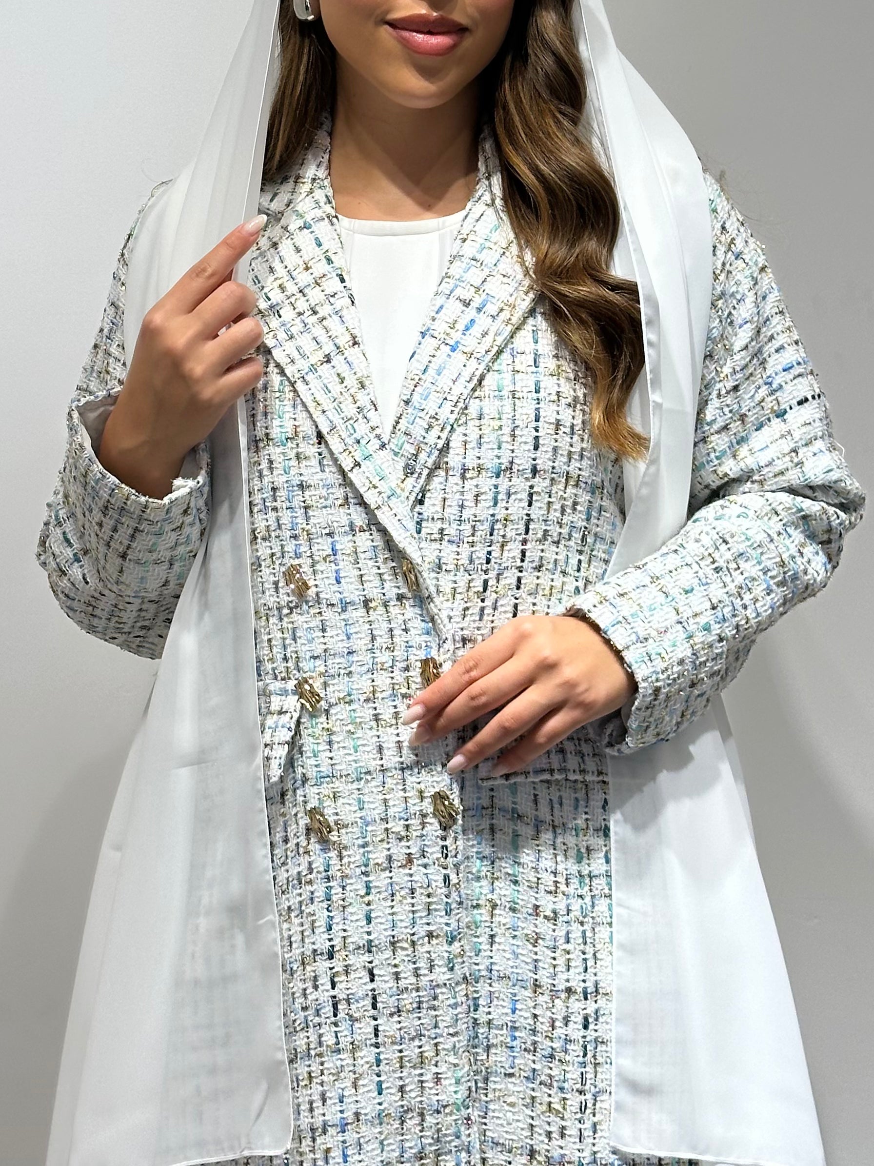 Step into refined sophistication with the White Blue Coat Abaya, beautifully crafted from premium tweed fabric for a structured and luxurious finish. The elegant coat-inspired design combines modern modest fashion with timeless grace — perfect for confident women seeking both comfort and class.