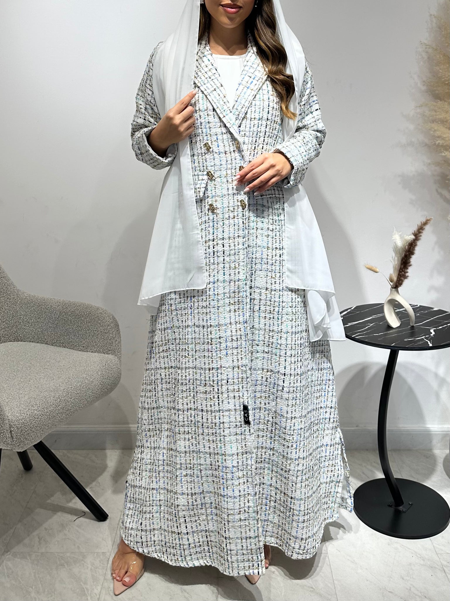 The tweed texture gives this abaya a rich, polished look, ideal for formal events, office wear, or stylish daily outings. Its subtle blend of white and blue adds a soft, elegant touch that complements every occasion.
