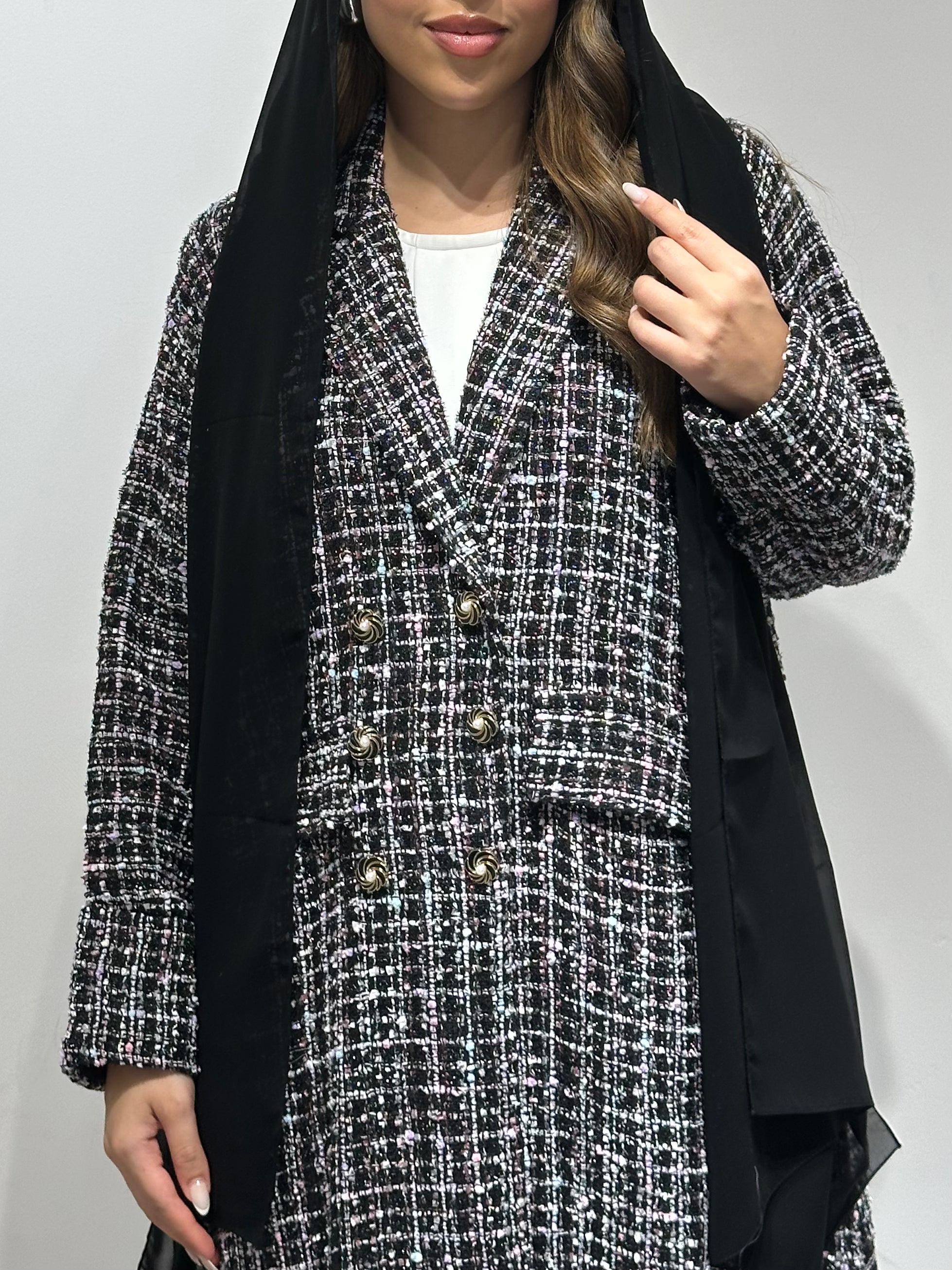 Elevate your wardrobe with the Black Pink Coat Abaya, an elegant blend of classic and contemporary modest fashion. Expertly tailored from premium tweed fabric, this abaya offers a refined, structured silhouette that reflects timeless sophistication. The subtle interplay of black and pink hues adds a feminine charm, making it perfect for formal occasions, business wear, or chic everyday outings.