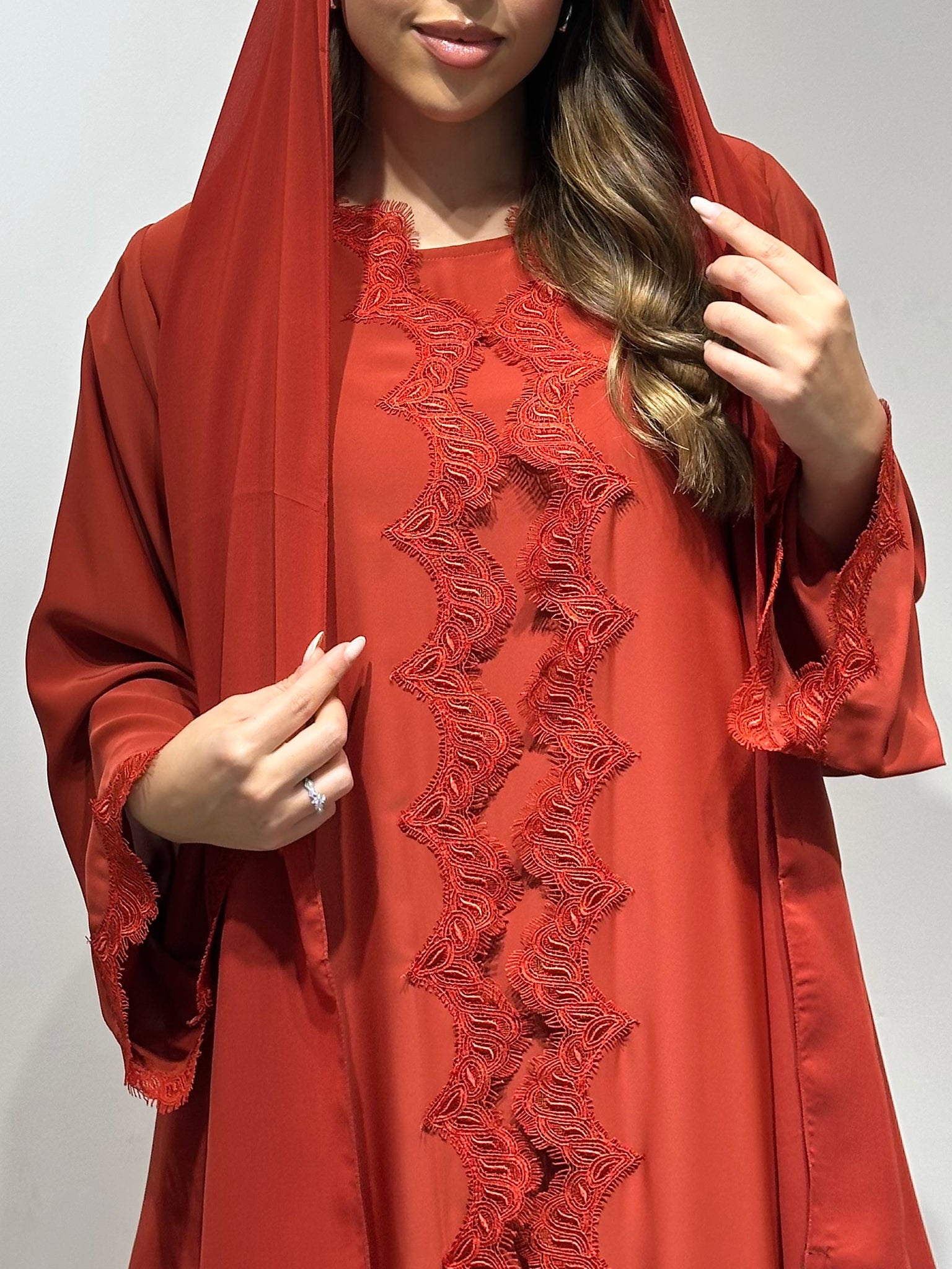 Bold, radiant, and beautifully detailed — the Burnt Orange Lace Abaya in Nada fabric captures the essence of modern elegance with a vibrant touch of warmth. Crafted from premium Nada fabric, it offers a luxurious matte texture and structured drape that flatters every movement. The delicate lace detailing adds refinement, creating a perfect balance between sophistication and contemporary charm.