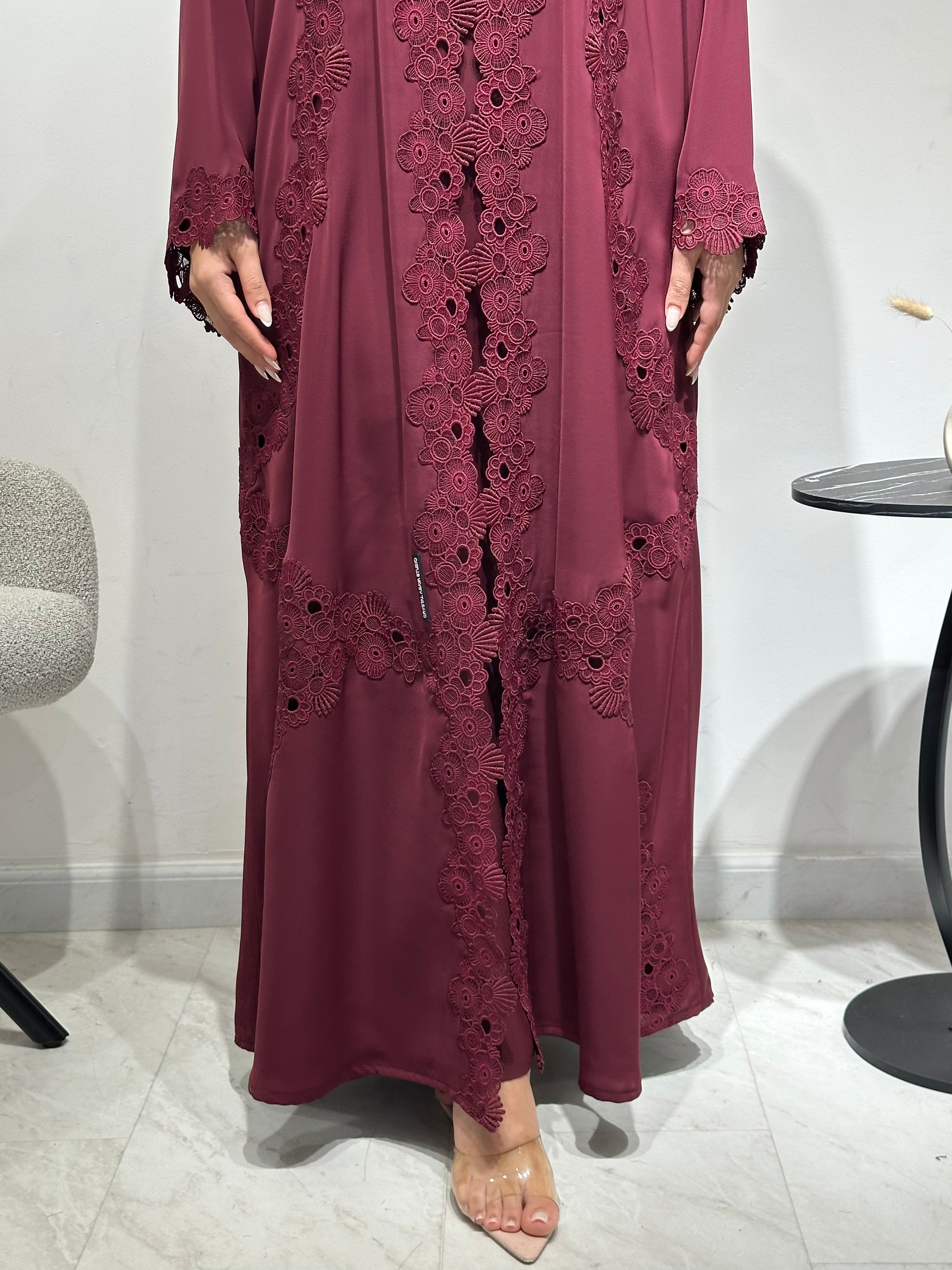 Rich, elegant, and timeless — the Burgundy Lace Abaya in Nada fabric is a stunning statement of sophistication and grace. Crafted from premium Nada fabric, this abaya features a soft matte texture with a fluid yet structured drape that exudes effortless refinement. The delicate lace detailing enhances its feminine allure, making it the perfect choice for special occasions, evening events, or elevated everyday wear.
